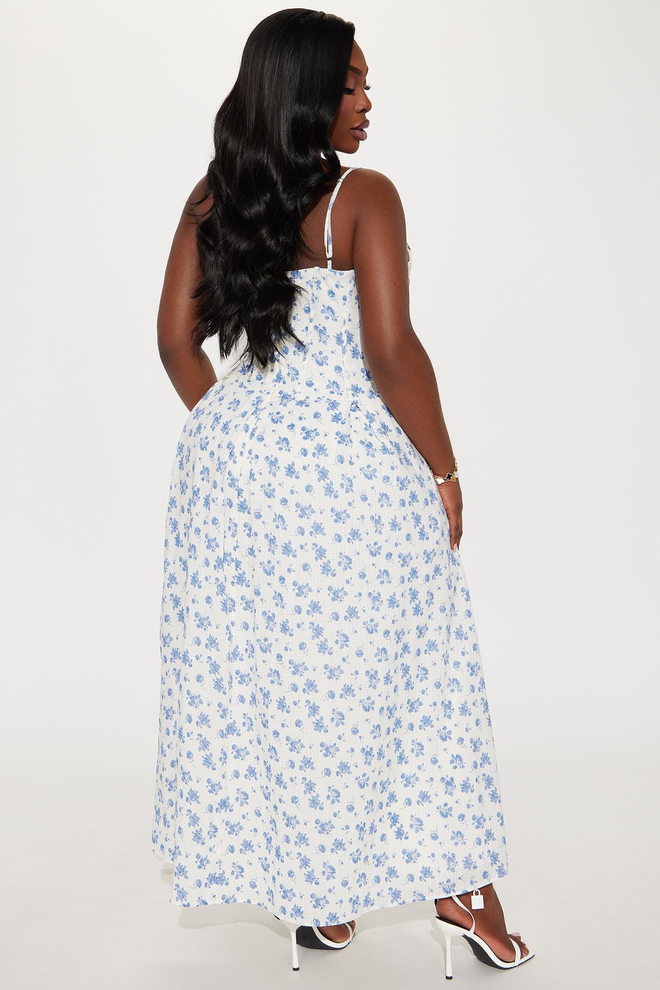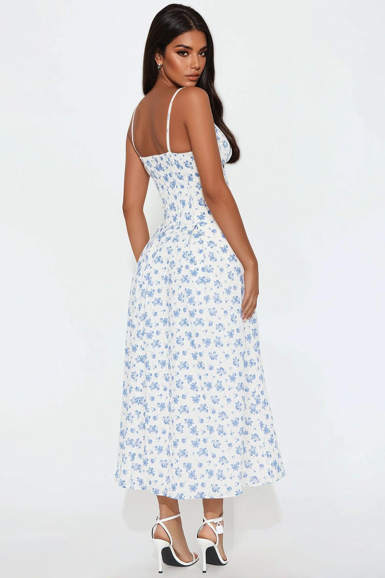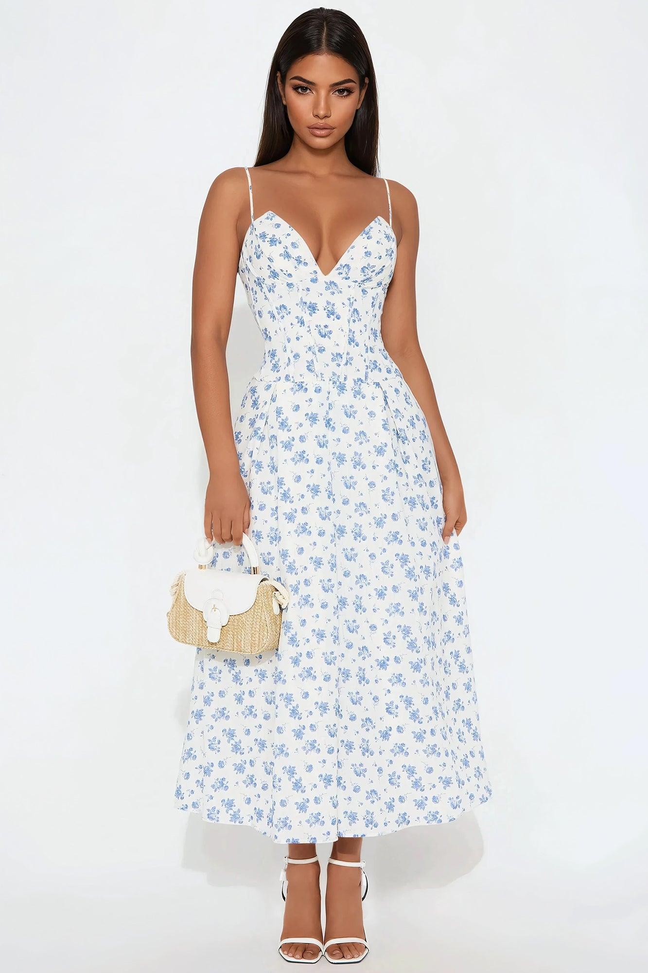 Available In White/Blue. Poplin Midi Dress V-Neck Spaghetti Straps Padded Bra Cups Corset Waist w/ Boning Back Zipper Tulle Lining Length = 47'' Disclaimer: Print Placement Will Vary SHELL 100% COTTON CONTRAST: 100% POLYESTER LINING: 94% POLYESTER 6% SPANDEX Imported
