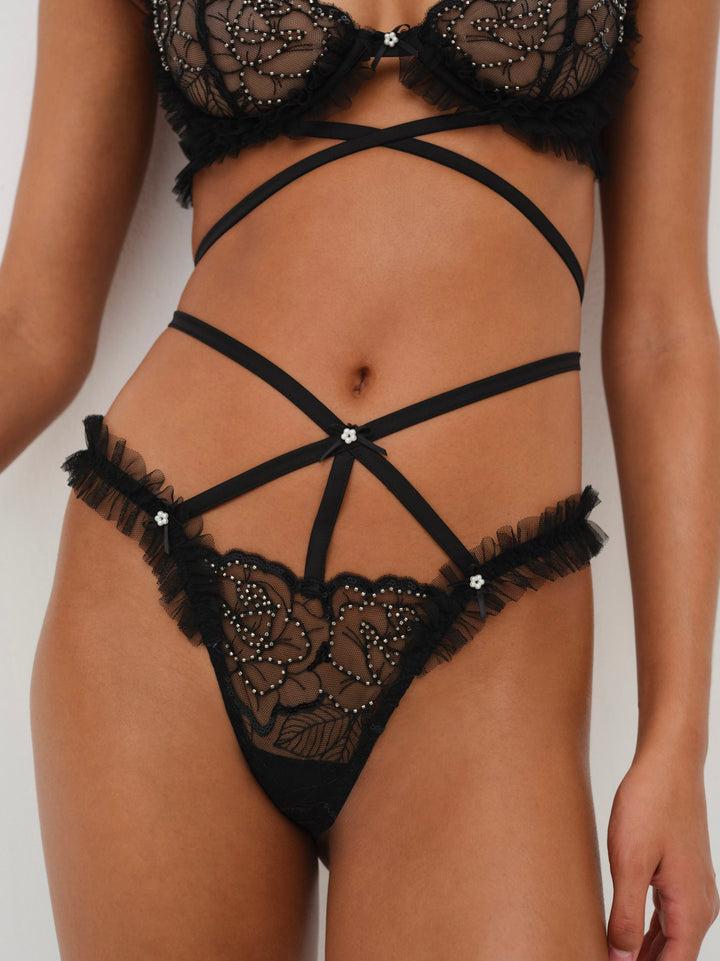For Love & Lemons for Victoria's Secret: Slip into the Estella black thong—a g string adorned in starlight bloom embroidery with scattered beads. Featuring contrast tulle and elasticized ruffles at the hips, it's completed with a pearl-beaded daisy and satin spaghetti straps that tie at the back for a sexy finish. Pair it with the Estella Underwire Bra for a mesmerizing matching set.