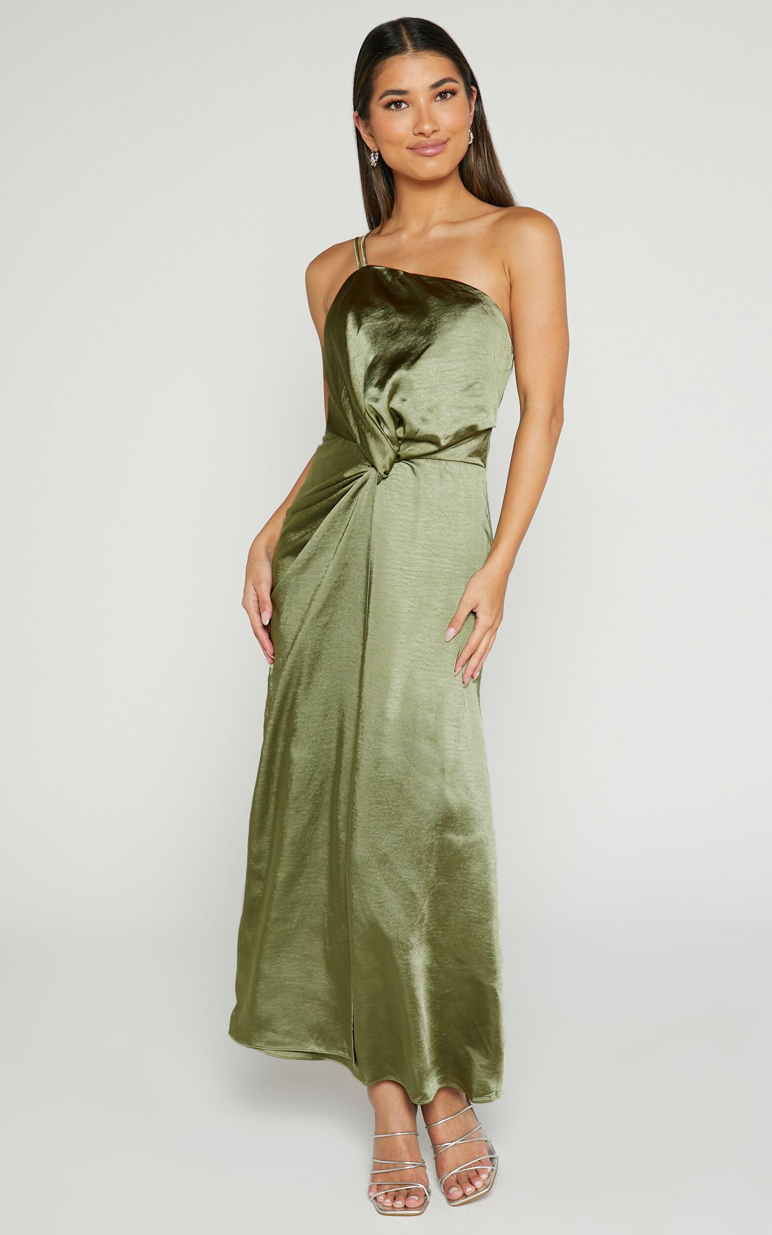Stand out from the crowd in our Estelle Midi Dress in Olive. This stunning one-shoulder formal dress is the perfect addition to your spring wardrobe. Made with high-quality polyester, it's both stylish and comfortable. The thigh split adds a touch of sophistication and allure, while the midi length keeps it classy. Whether you're attending a wedding or a fancy dinner party, this green dress will make you feel confident and empowered. Embrace your individuality and show off your unique sense of style with our Estelle Midi Dress.Product Details:One Shoulder Formal DressMidi lengthMade from Polyester fabricSize and FitSize S / 8 length: 124cm / 48.82inMaterial and CareMain Fabric: 100% PolyesterLow / No stretch