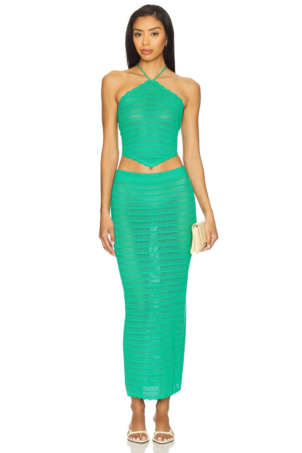 72% viscose, 28% polyester. Hand wash. Halterneck and back tie closure. Crochet knit fabric. Item not sold as a set. Garment is made with a semi-sheer fabric, undergarments can show through. Made in China. Revolve Style No. AFFM-WS471. Manufacturer Style No. AS001692MY25.