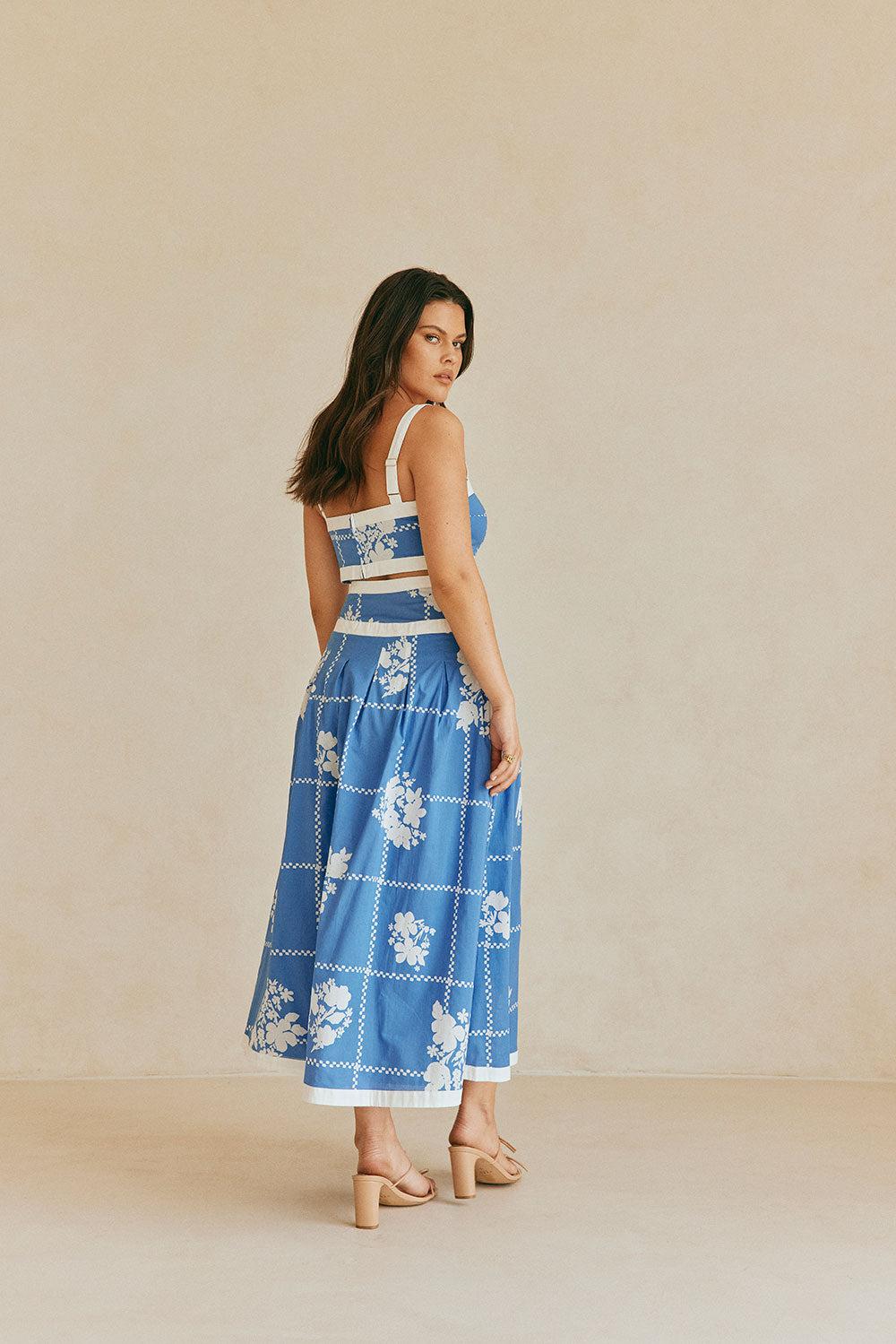 A super cute set perfect for a long lunch or event! The Estelle Midi Skirt is made from a high quality natural cotton voile fabric with our exclusive check flowers print. It is a high waisted wrap style featuring contrast white trims at waist, wrap panel at front with tie closures and a midi length skirt with reverse pleats across waist. Get the look with the Estelle Top and Bobbi Heels! Designed exclusively by Sabo.