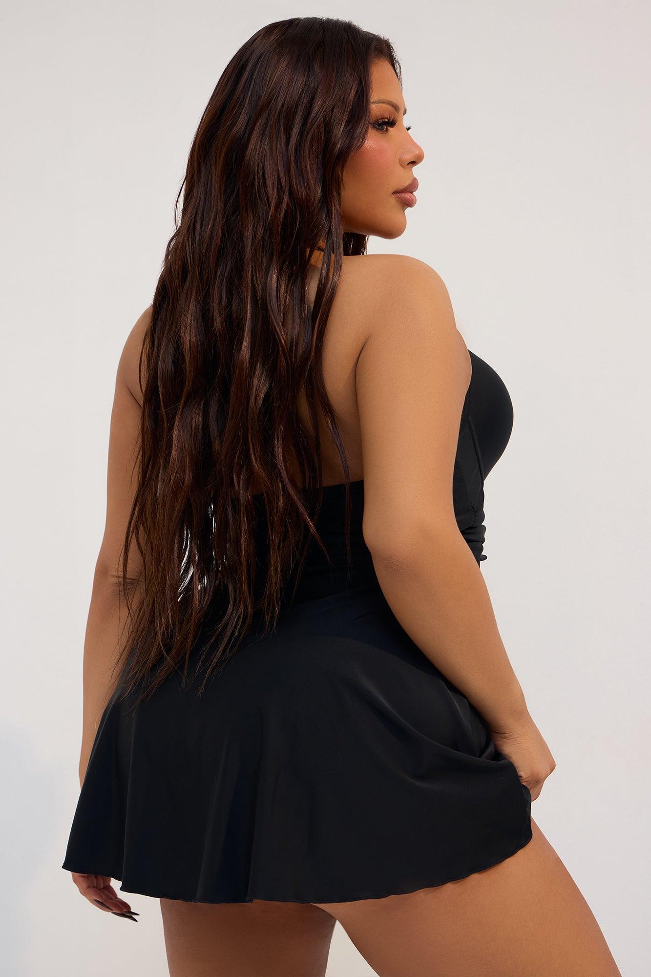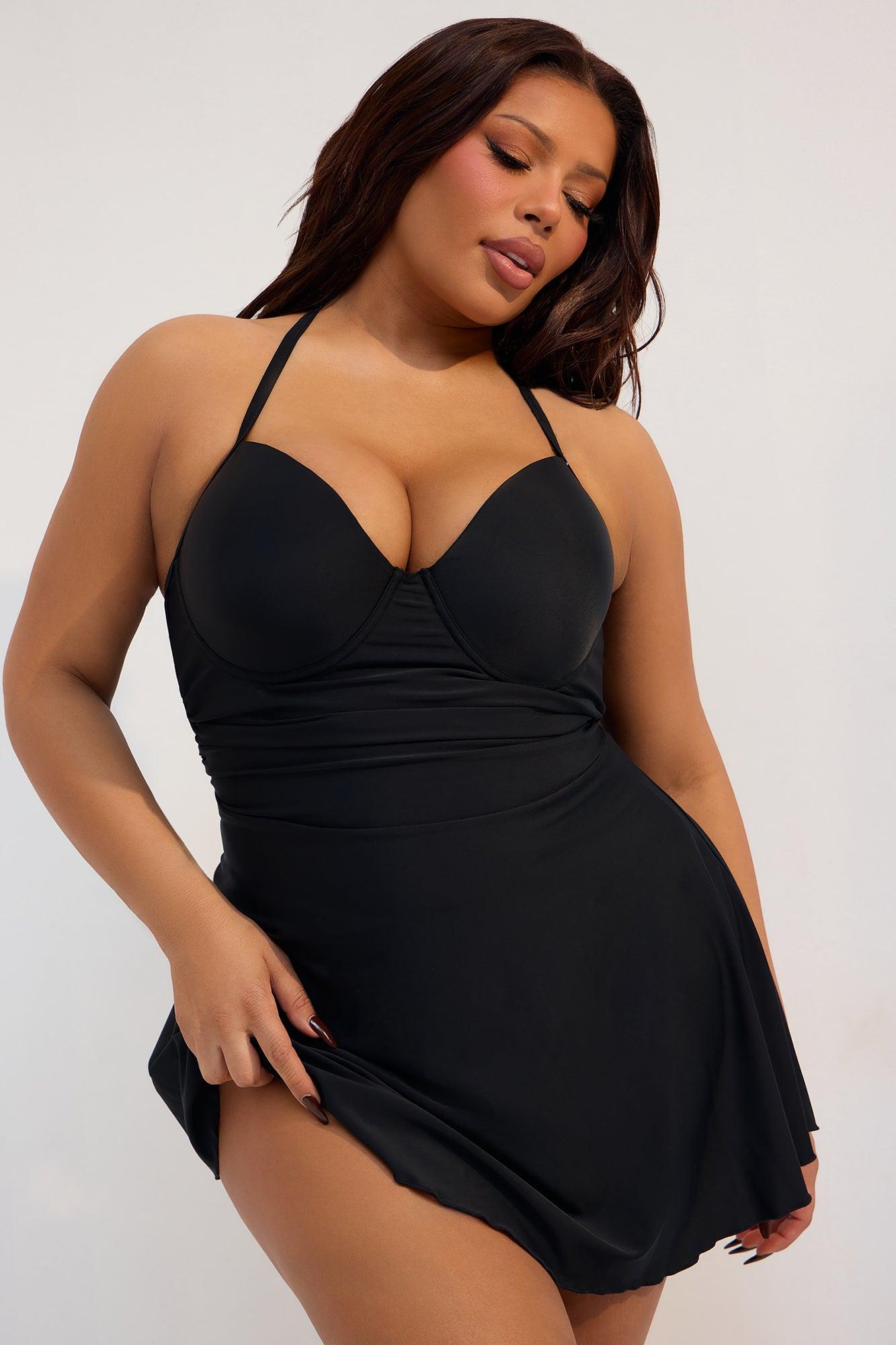 Available In Black. We Heard You And Have Perfected The Style! Bikini Bottoms Now Included As Set Dress Swimsuit Set Mini Bra Cup Halter Neck Ties High Waist Bikini Bottom Cheeky Full Stretch Final Sale Shell: 82% Nylon 18% Spandex Cup Lining: 92% Polyester 8% Spandex Lining: 90% Polyester 10% Spandex Imported