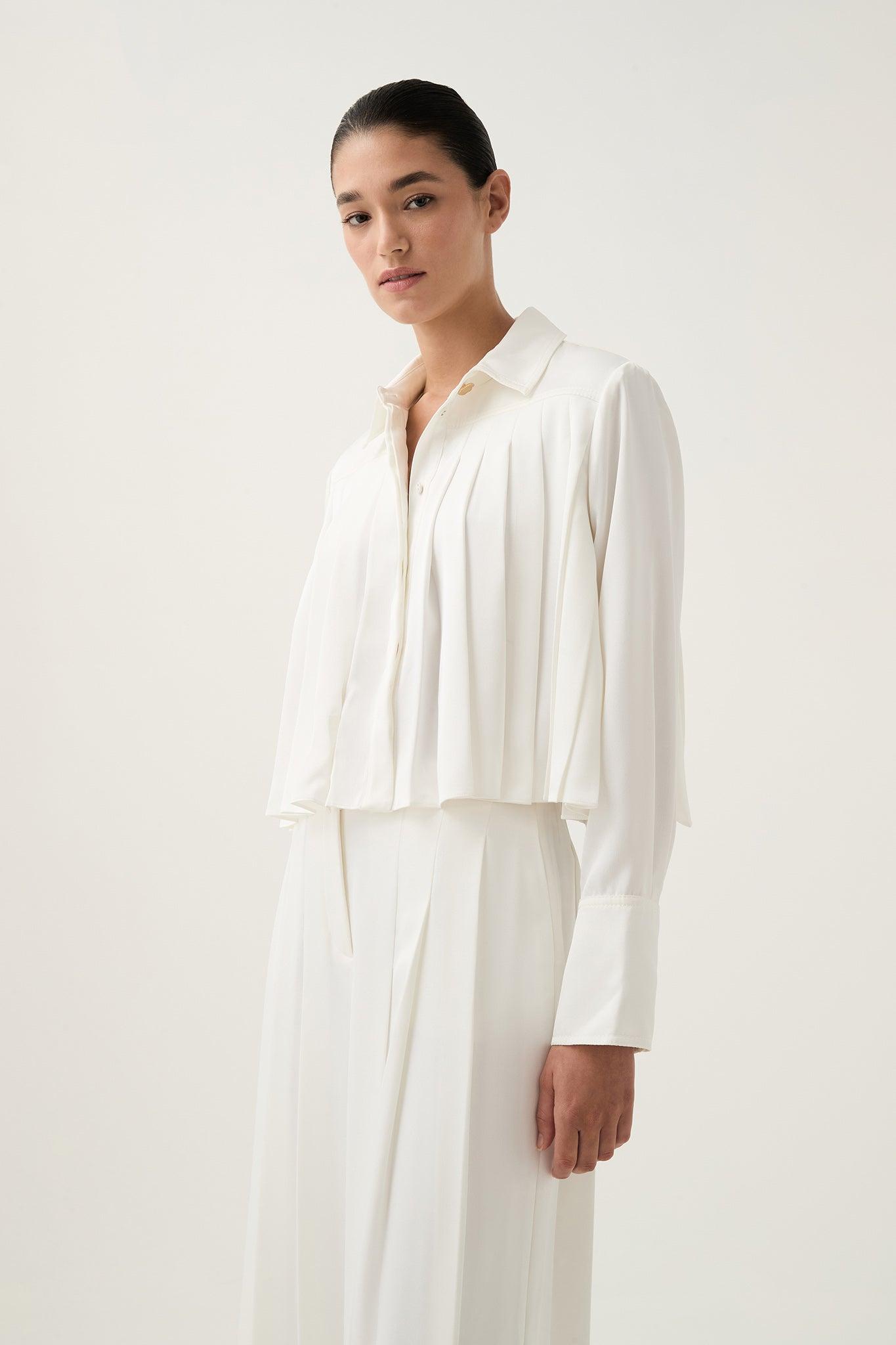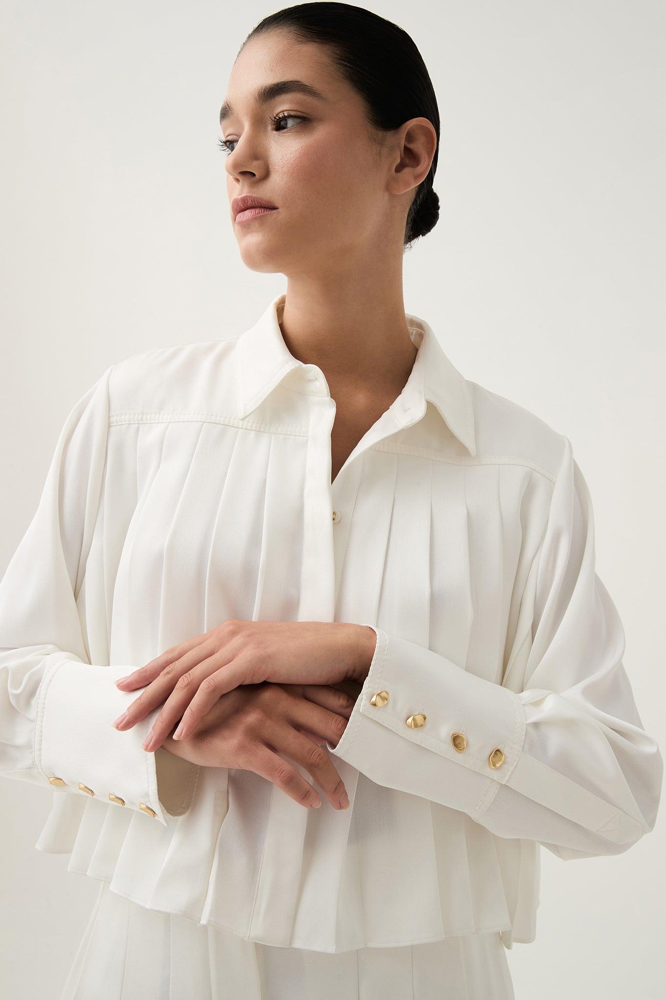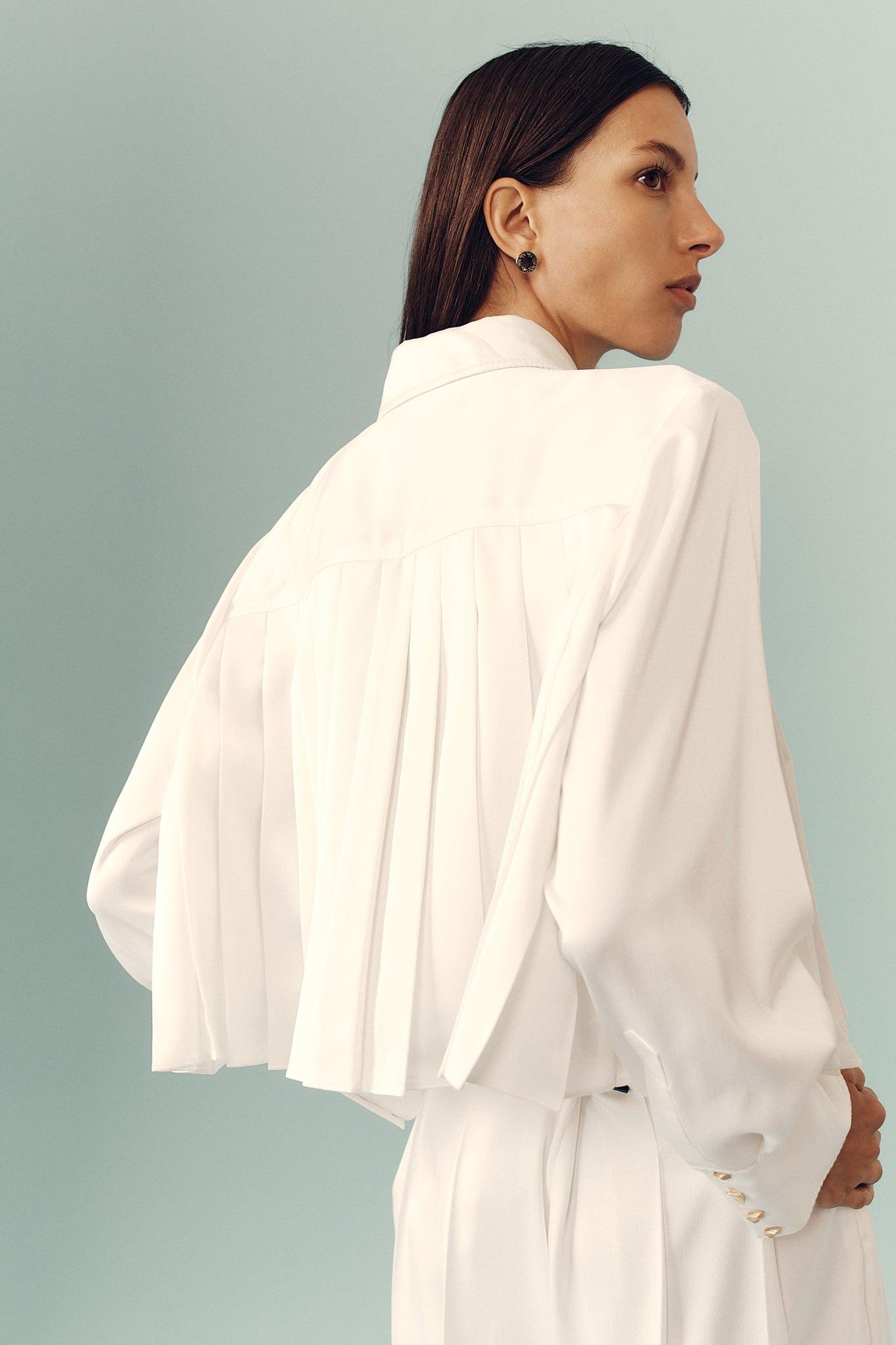 PRODUCT DETAILS Women’s shirt Relaxed, cropped fit Pleating throughout Shirt collar with gold accent button Concealed front button-up placket Straight sleeves with exaggerated cuffs Shop All Tops SIZE AND FIT Oversized fit We recommend going down 2 sizes for a 'truer to size' fit Model wears a size 8/S Model: 177cm/ 5'10 Bust: 80cm Waist: 58cm Hips: 88cm FABRICATION 53% Recycled Polyester 47% Polyester