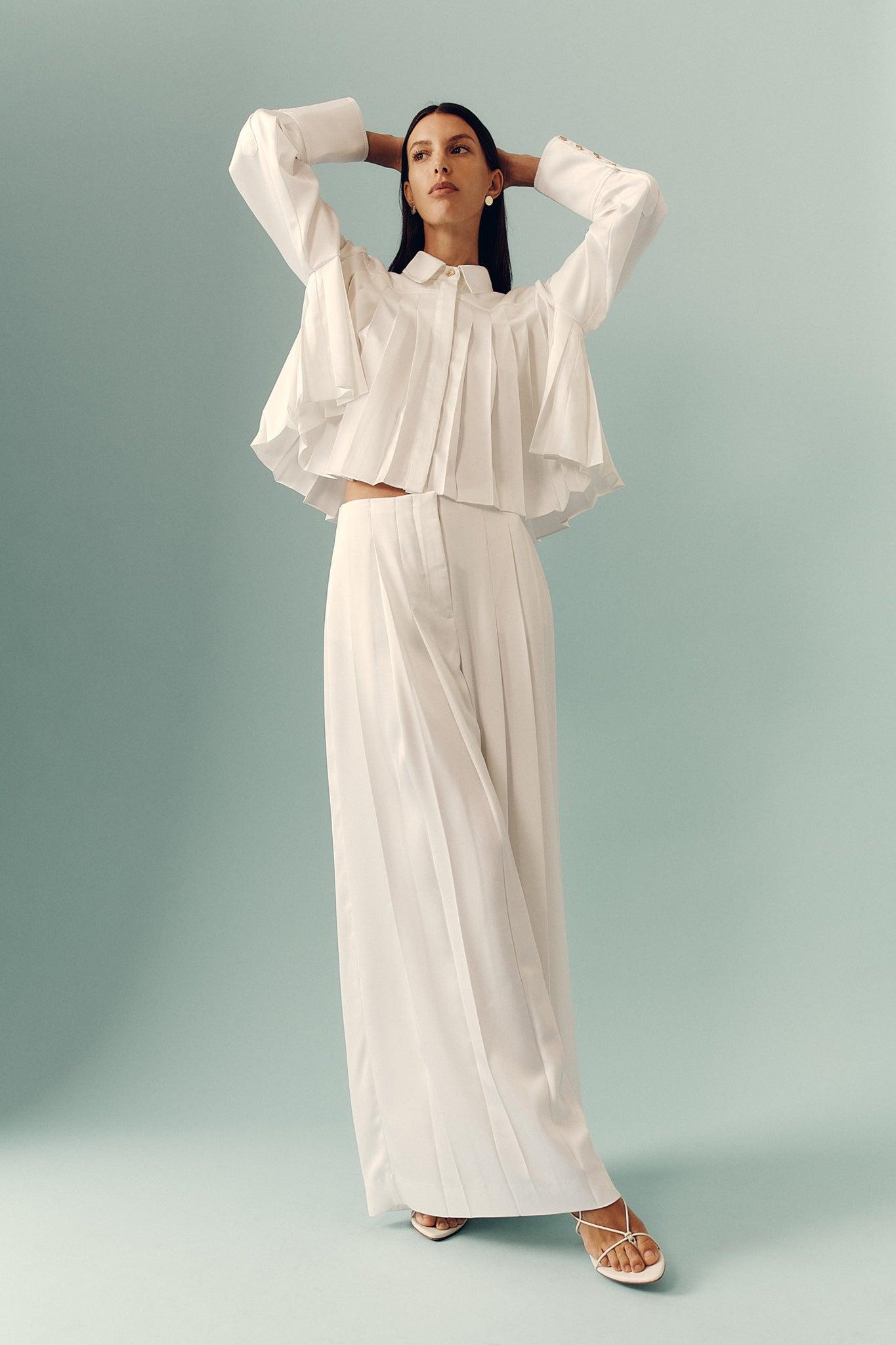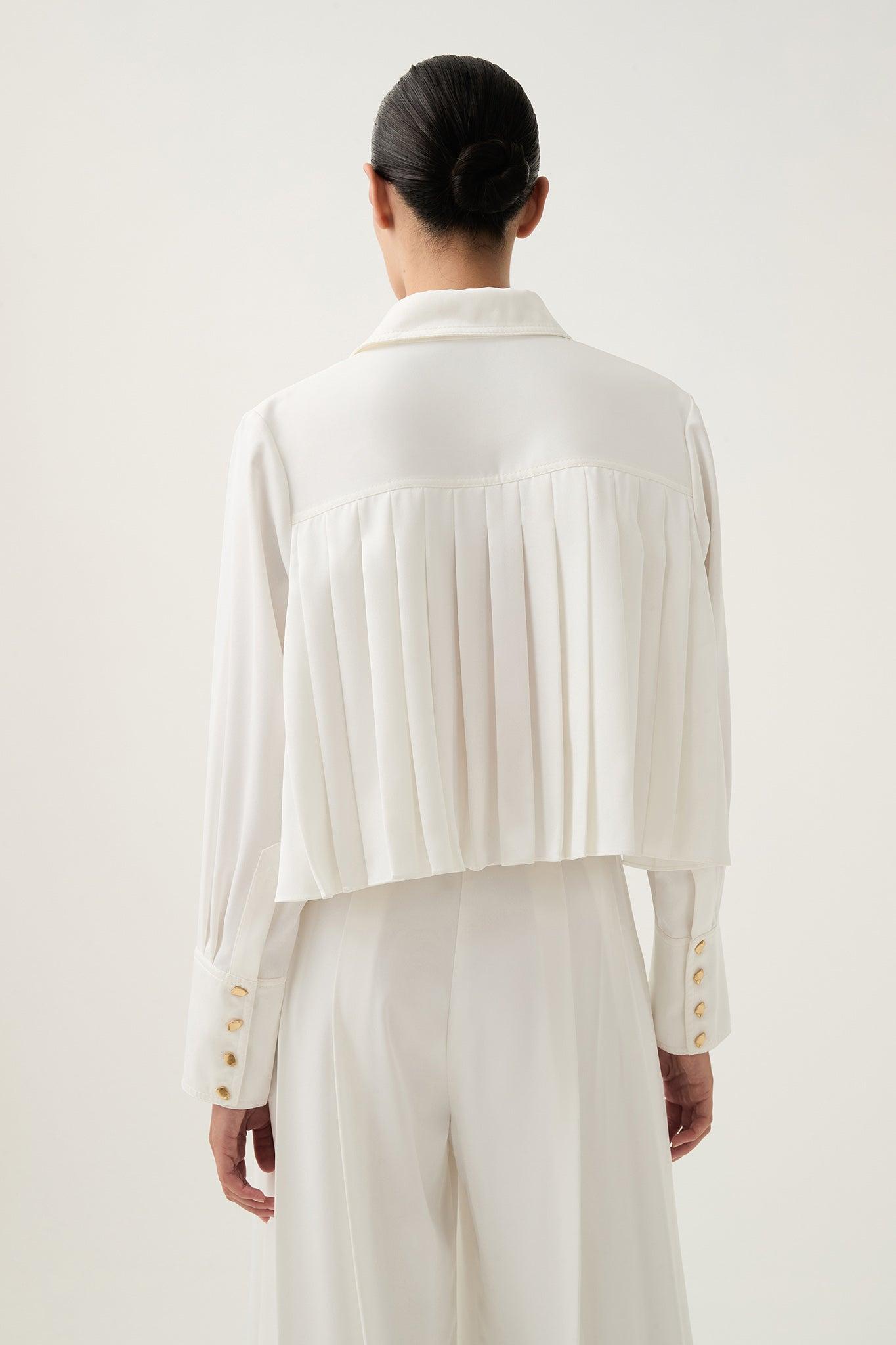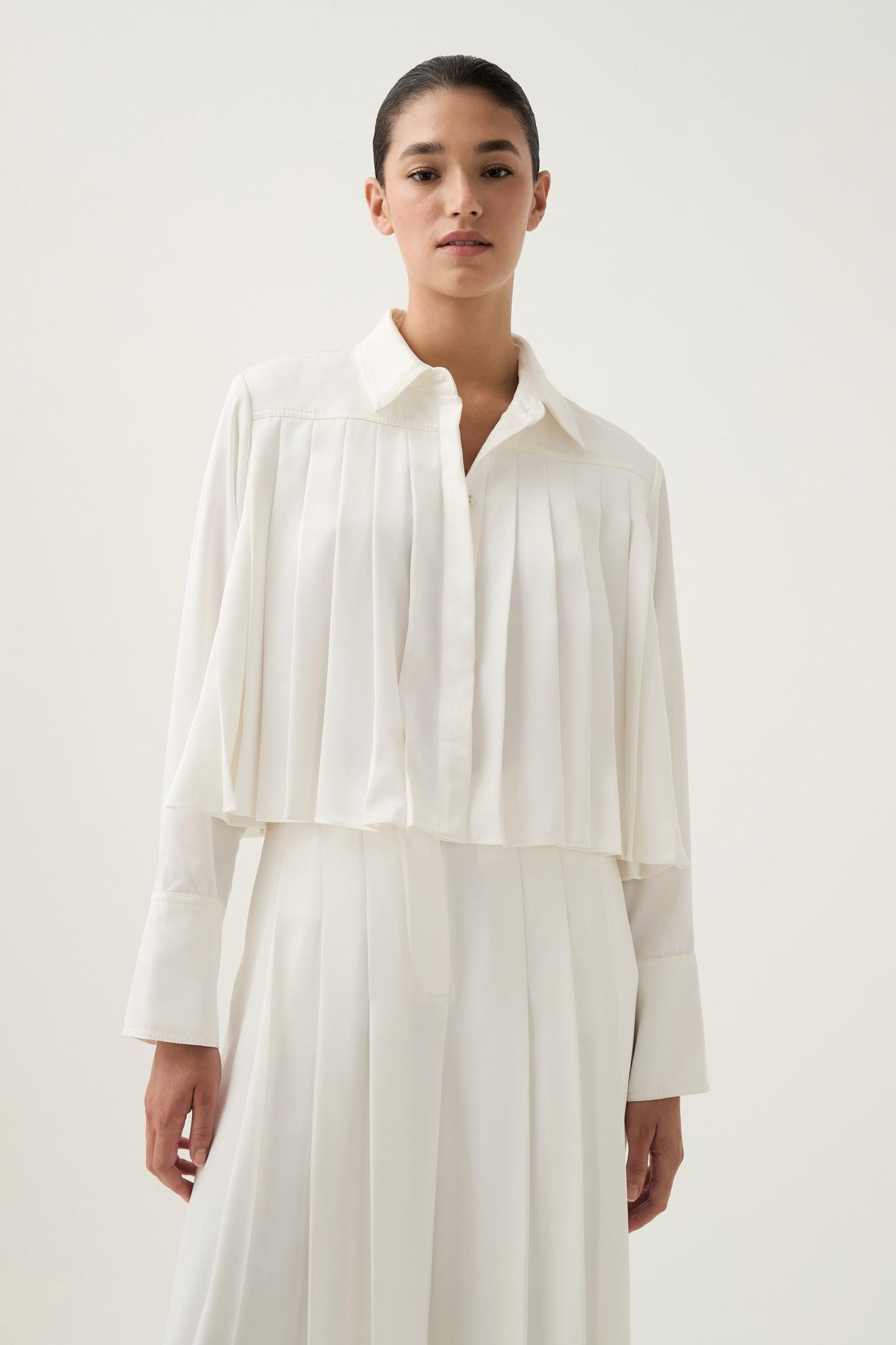 PRODUCT DETAILS Women’s shirt Relaxed, cropped fit Pleating throughout Shirt collar with gold accent button Concealed front button-up placket Straight sleeves with exaggerated cuffs Shop All Tops SIZE AND FIT Oversized fit We recommend going down 2 sizes for a 'truer to size' fit Model wears a size 8/S Model: 177cm/ 5'10 Bust: 80cm Waist: 58cm Hips: 88cm FABRICATION 53% Recycled Polyester 47% Polyester