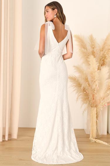Let your forever begin in the most stylish way possible—by wearing the Lulus Eternally Yours White Lace Tie-Strap Mermaid Maxi Dress! Gorgeous floral lace (atop a matching stretch knit liner) shapes this breathtaking dress that has a princess-seamed bodice with plunging arm openings (with nude mesh inserts) and a flattering V-neckline and back, supported by long organza sashes that tie at the shoulders. The fitted waist tops a figure-flaunting skirt that boasts a mermaid-style silhouette as it falls to a maxi hem with an elegant train at the back.