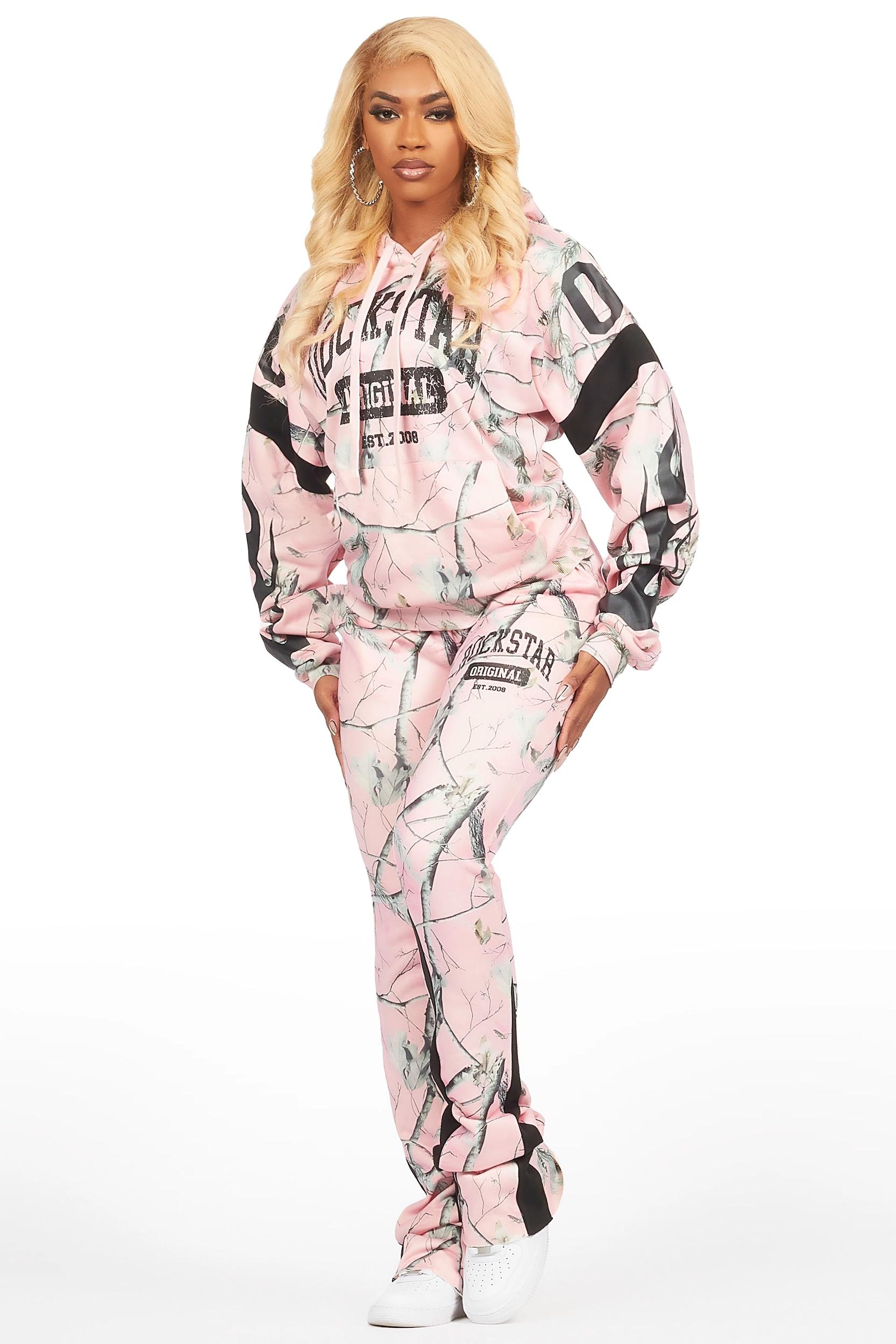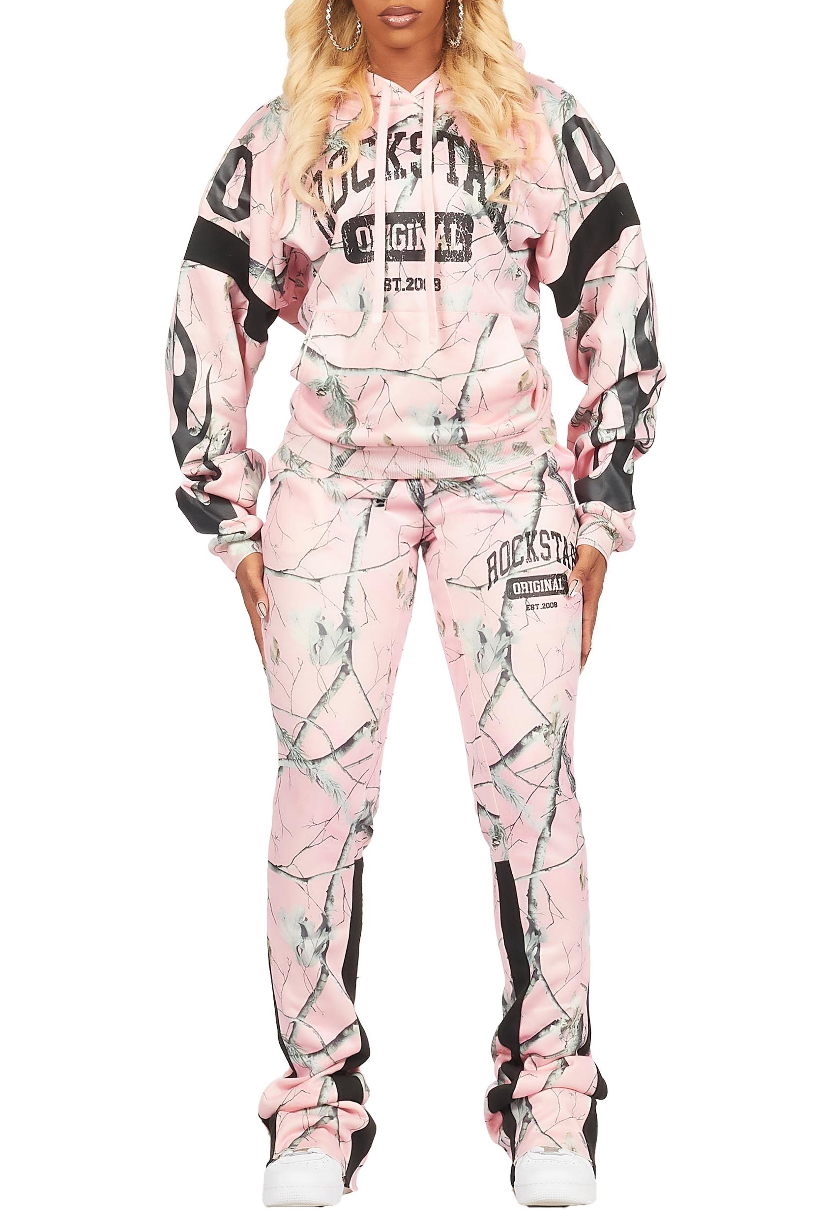 A trendy two-piece super stacked tracksuit set for women in pink tree camo. Designed with ultra soft fabric for the perfect everyday set. Drawstring hood Ribbed knit trims Kangaroo pocket Printed RSO logos Custom paint splatter Drawstring waistband Dual slant pockets Super stacked construction Flare leg openings 42" inseam