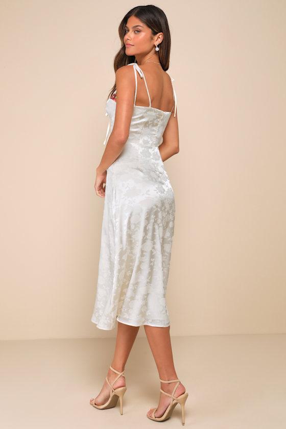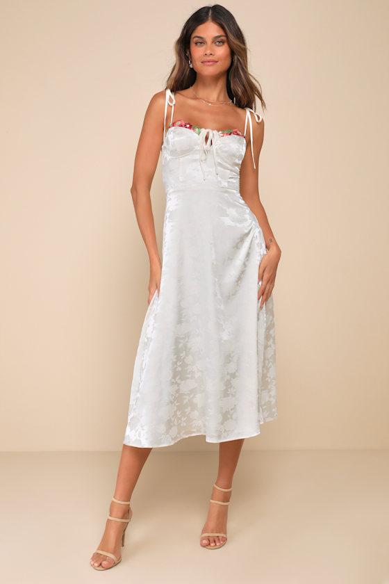 Make your day extra whimsical by slipping into the Lulus Ethereal Muse Cream Satin Jacquard Embroidered Midi Dress! Sleek woven satin jacquard boasts a sweet floral pattern as it falls from tying straps into a sweetheart neckline that features colorful floral embroidered trim and a sweet tying keyhole detail. The bustier-inspired bodice and high, fitted waist sit atop a classic A-line skirt that finishes at a chic midi hem. Hidden back zipper/clasp.