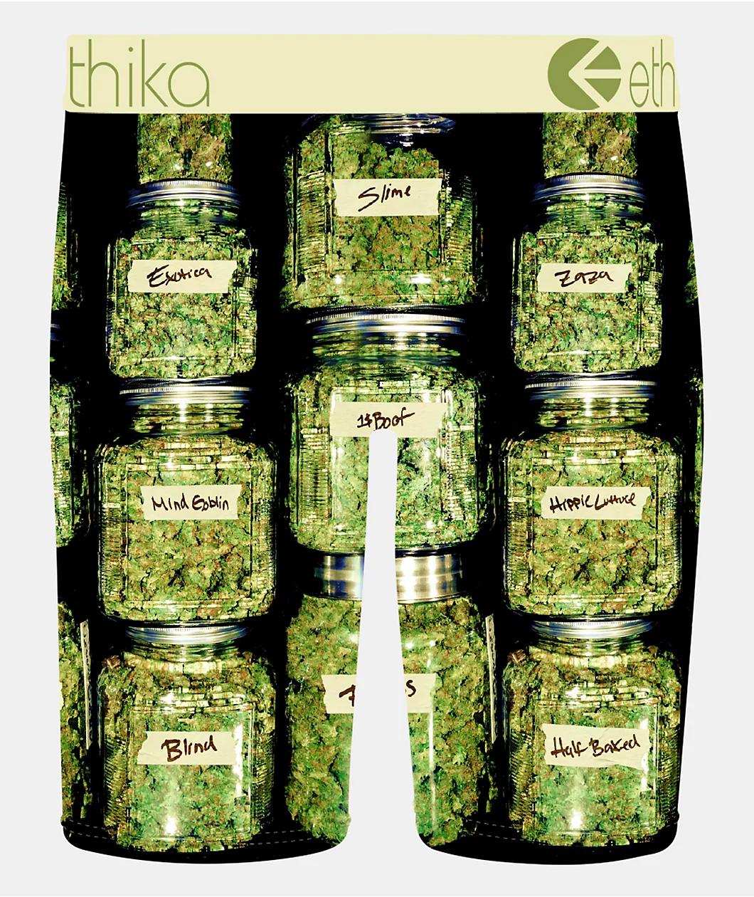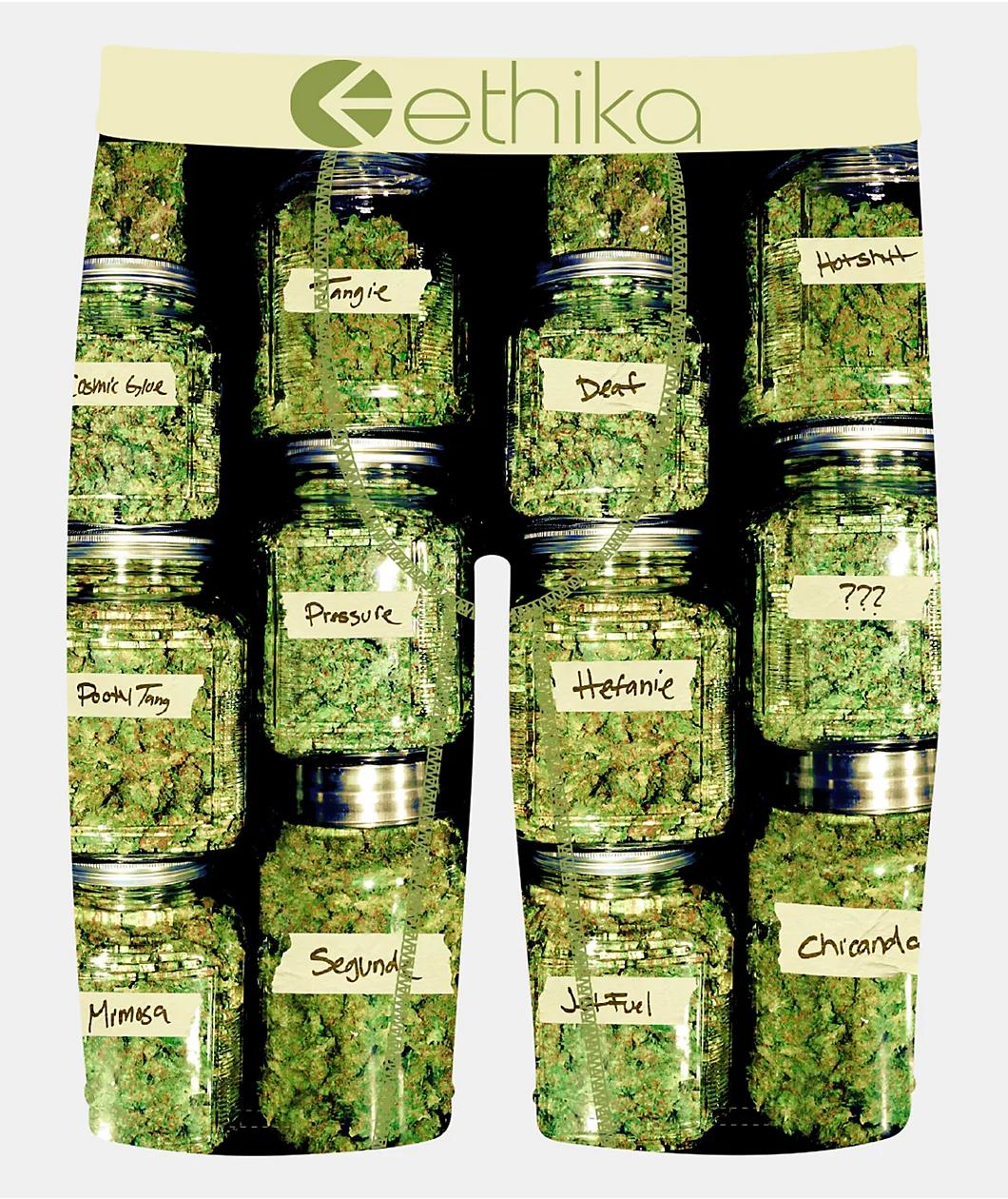 Discreetly add a 420-friendly vibe to your outfit with the Ex-Zaatics boxer briefs from Ethika. Showcasing loud sublimated imagery of jars filled with nugs of cannabis throughout the underwear. These boxers are finished with a thick no-rise branded w