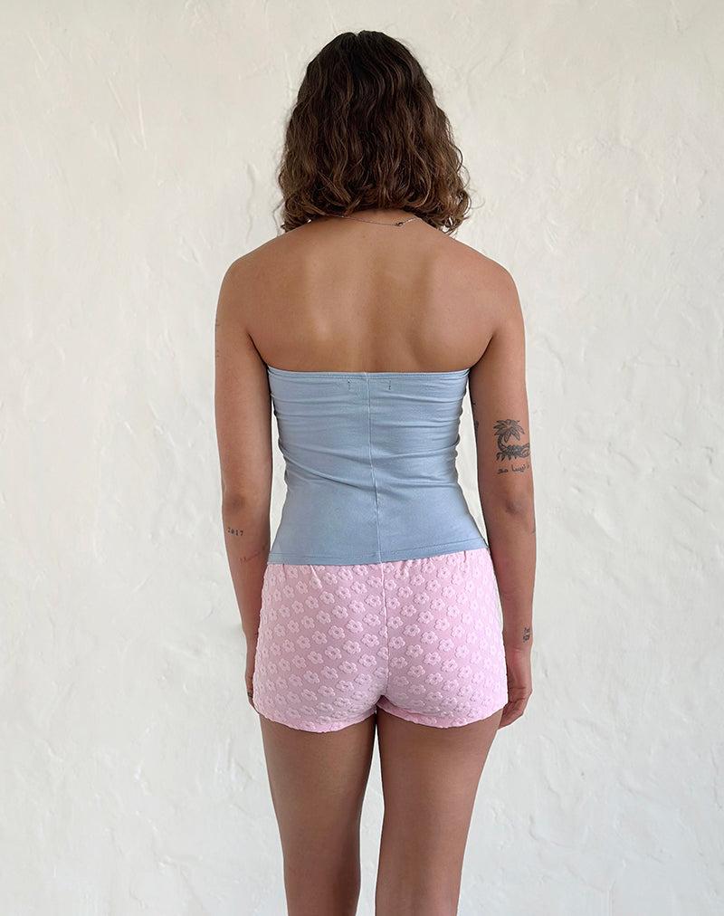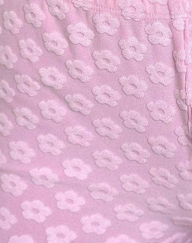 Low rise fitted hot pant with a thick elasticated waistband in a soft stretch terry toweling fabric with an all over mini flower jacquard in a soft pink. MODEL WEARS SIZE: EXTRA SMALL - MODEL HEIGHT:5'6