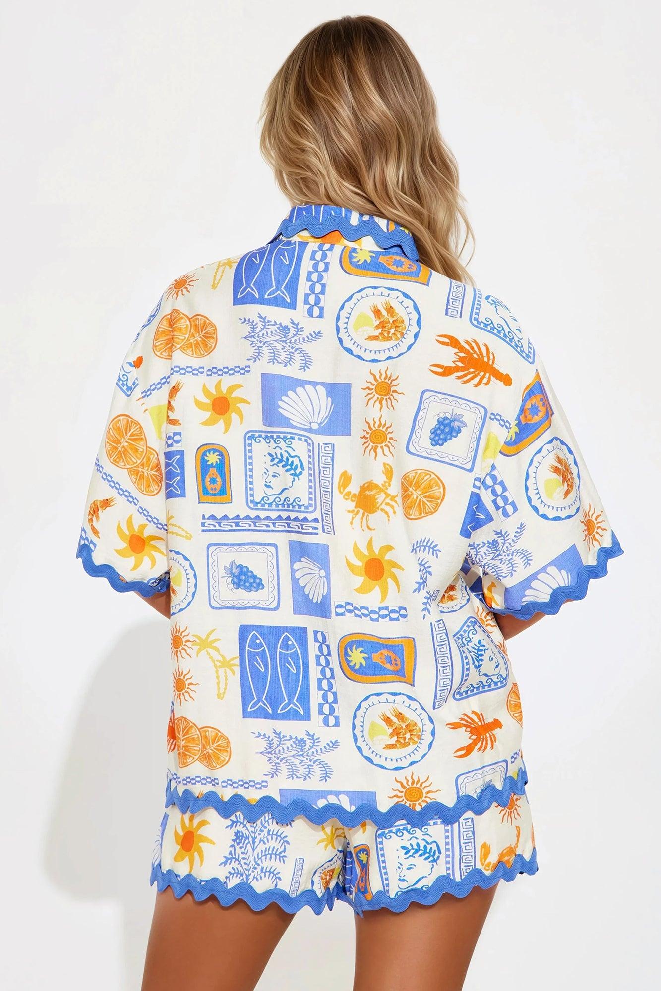 Available In Blue/combo. Shirt And Short Set Non Stretch Pockets Short Lining Disclaimer: Due To The Printing Process A Difference In Saturation May Occur. Each Garment Is Unique. Self: 80% Rayon 20% Nylon Shorts Lining: 100% Rayon Imported California Proposition 65 WARNING: Cancer and Reproductive Harm - www.P65Warnings.ca.gov.