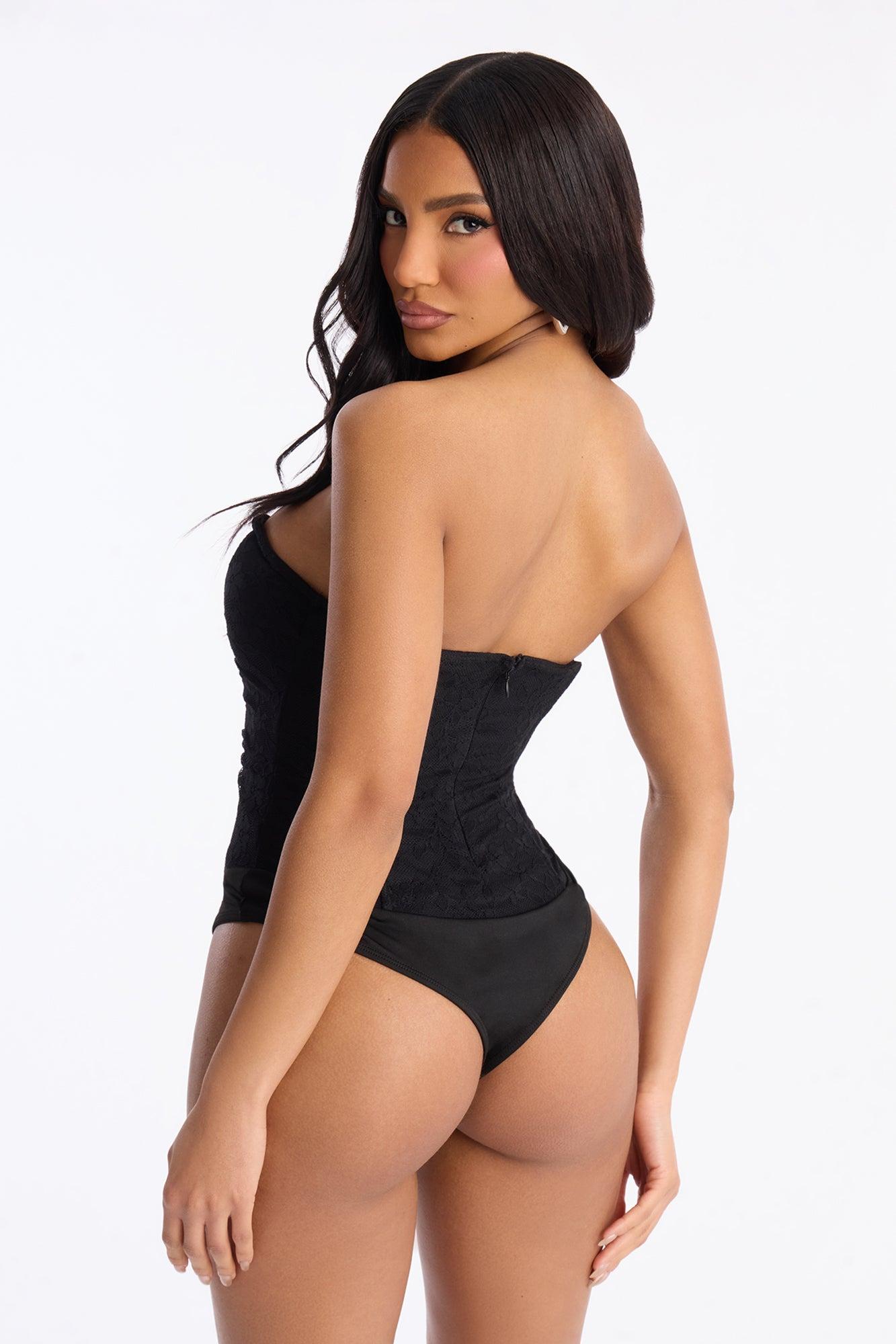 Available In Black. Lace Bodysuit Sweetheart Neckline Strapless Boning Invisible Back Zipper Backless Snap Button Closure Thong Bottom Stretch Final Sale Self: 90% Nylon 10% Spandex Contrast: 95% Polyester 5% Spandex Lining: 95% Polyester 5% Spandex Imported