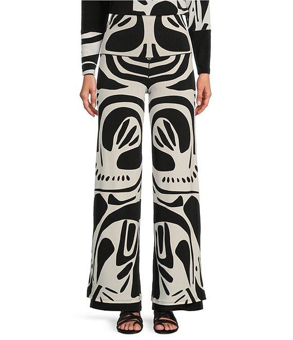 From Eva Varro, these pants feature: Knit jersey fabrication Abstract print and black solid lining Elasticized high waistline Straight leg with outside leg slit Pull-on construction Approx. 32" inseam Polyester/spandex Hand wash Made in the USA.