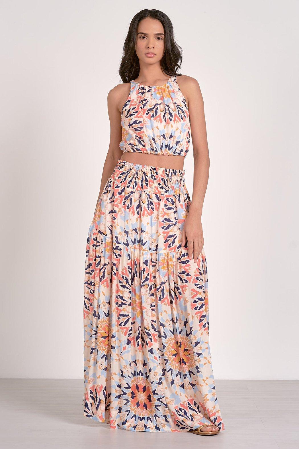 A carefree silhouette with elevated charm, the Evan Halter Top brings playful ease to your warm-weather wardrobe. Featuring a gathered neckline and cropped hem with subtle stretch, this top balances comfort and style effortlessly. Its flowy, lightweight drape moves beautifully with you, perfect for sunlit strolls, market runs, or laid-back weekends. Pair it with its matching skirt for a coordinated look or mix it up with high-rise denim for everyday cool.
