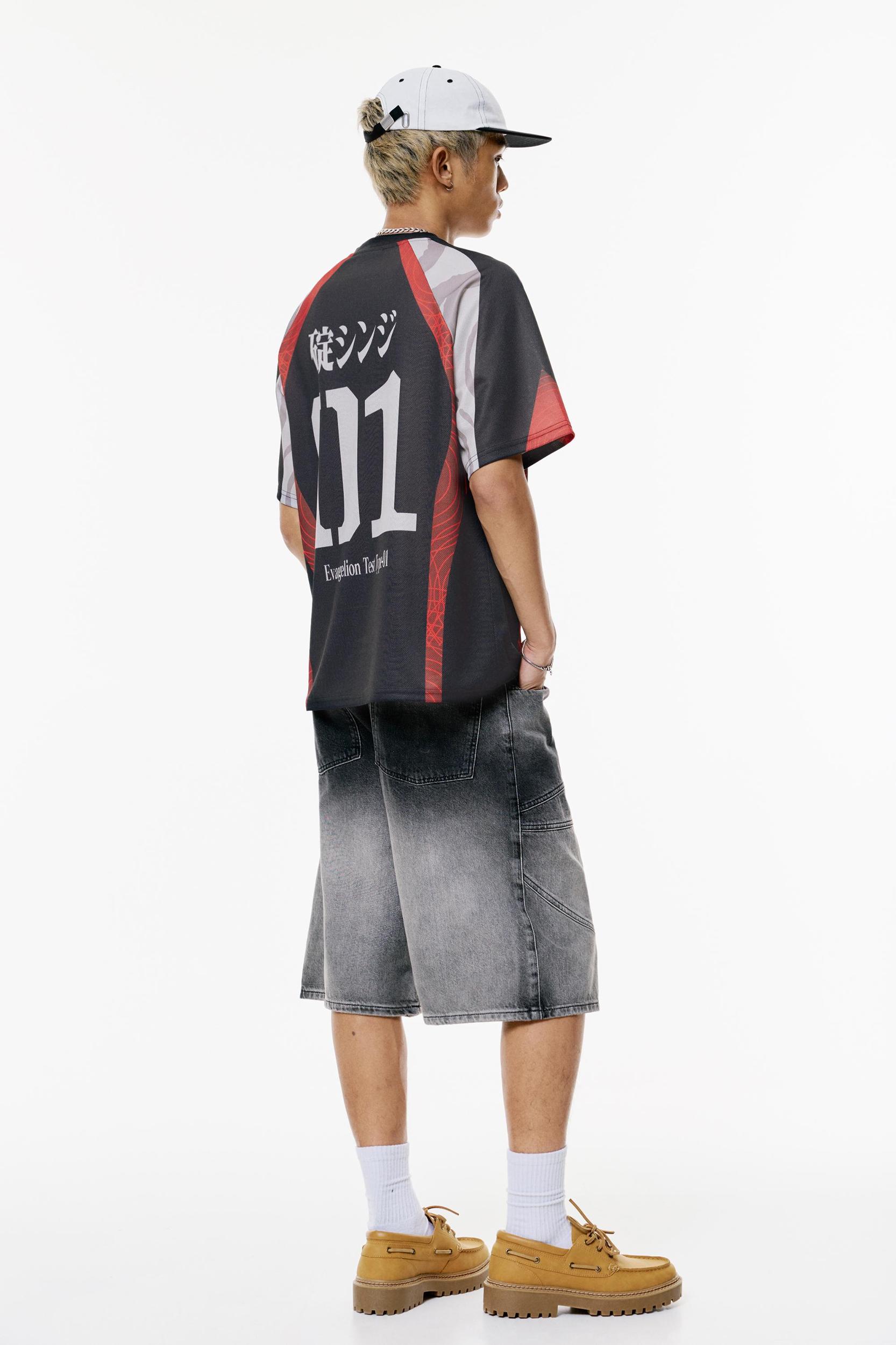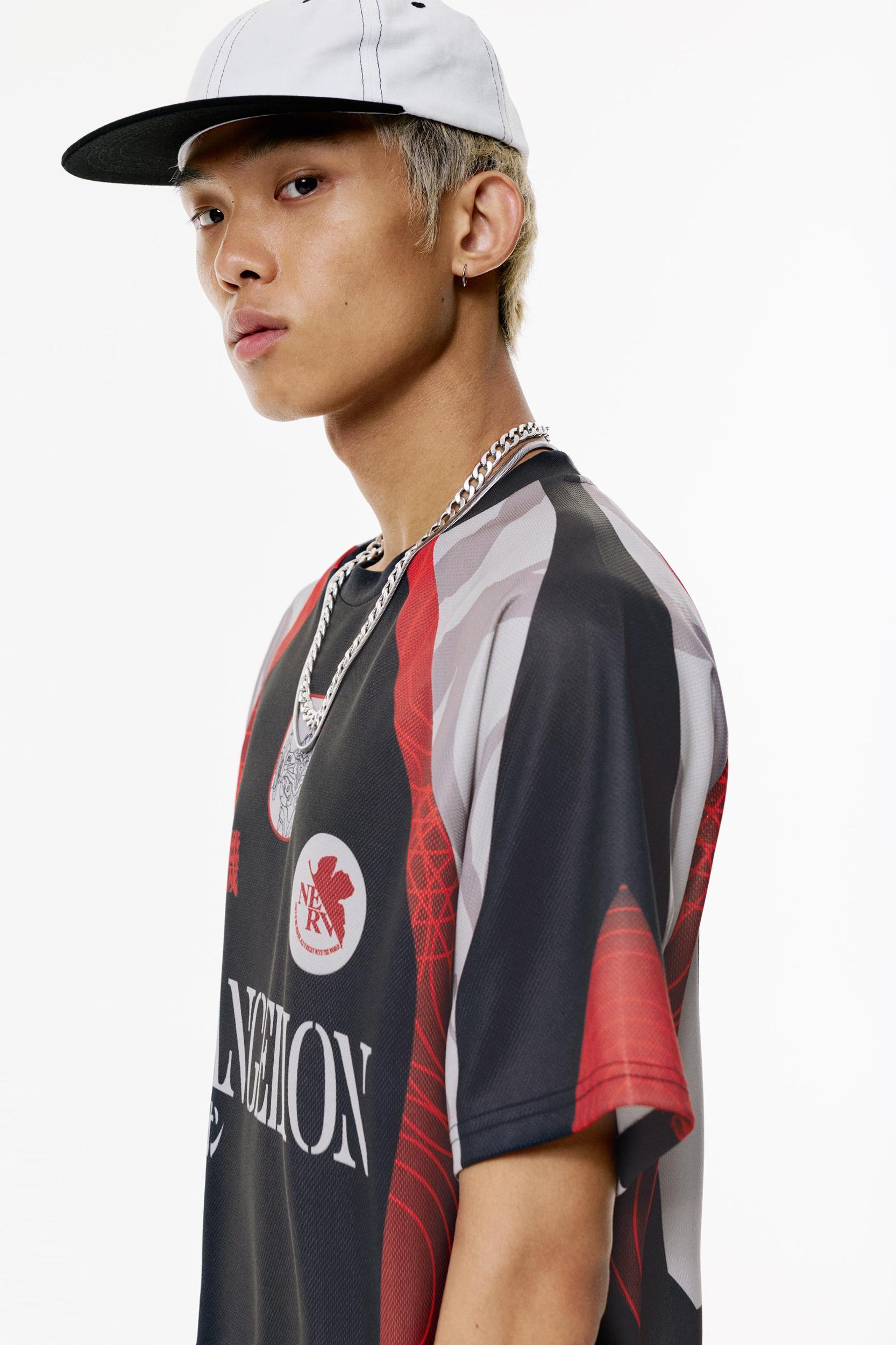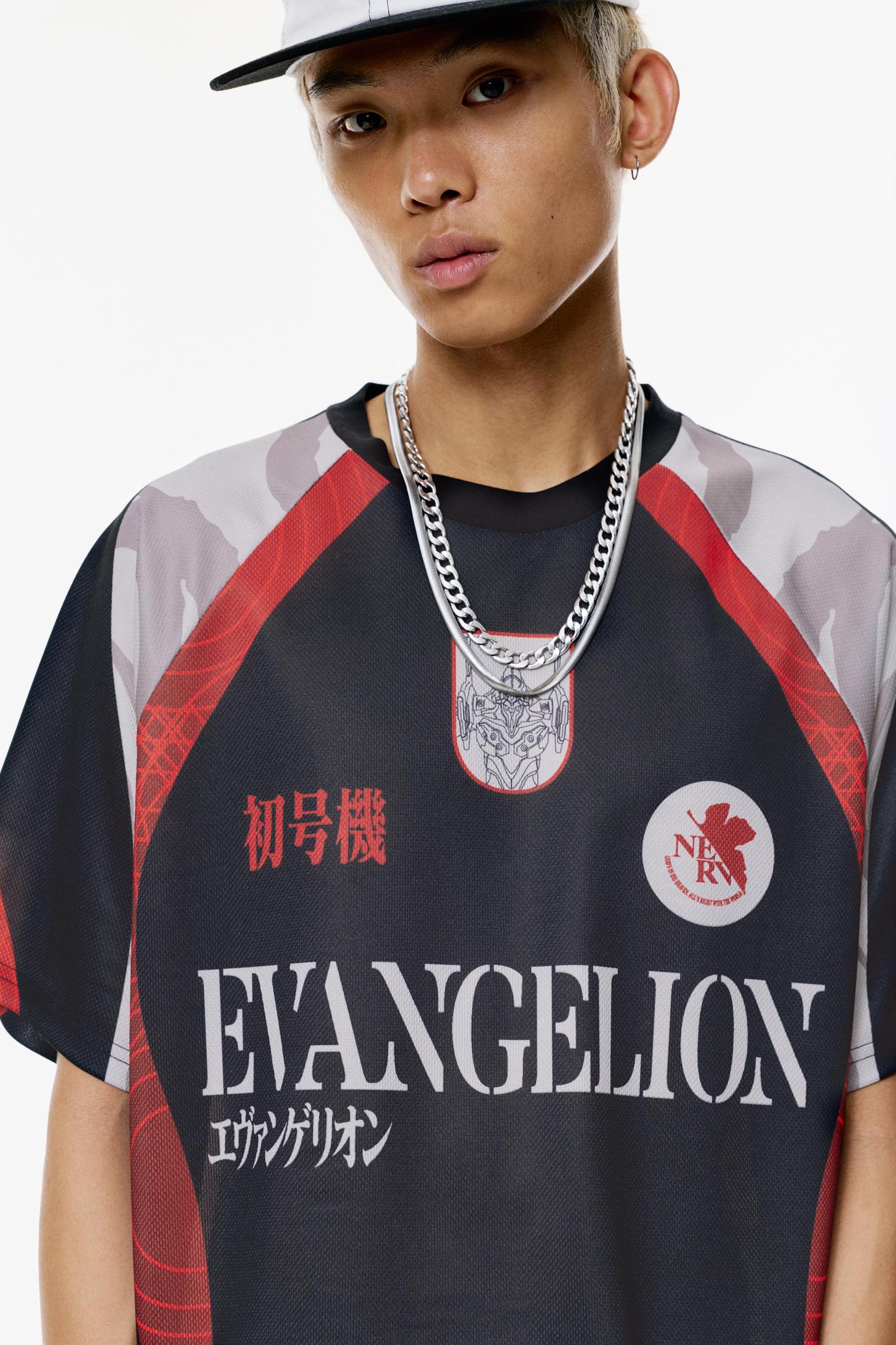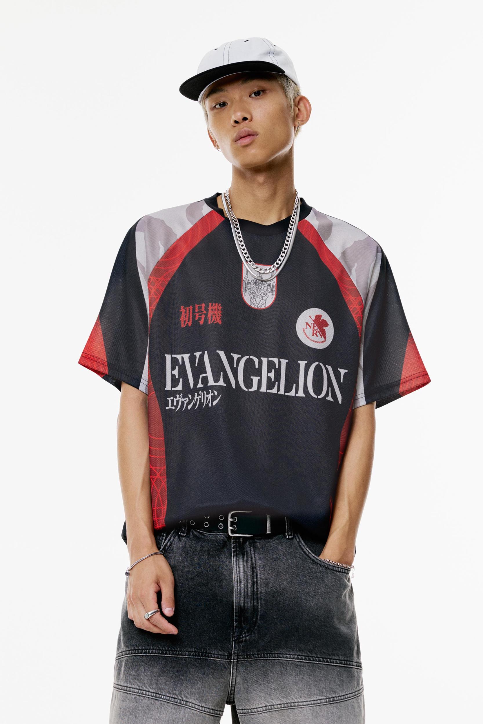 Evangelion license soccer T-shirt with short sleeves, a crew neck and graphics on the front and back.
