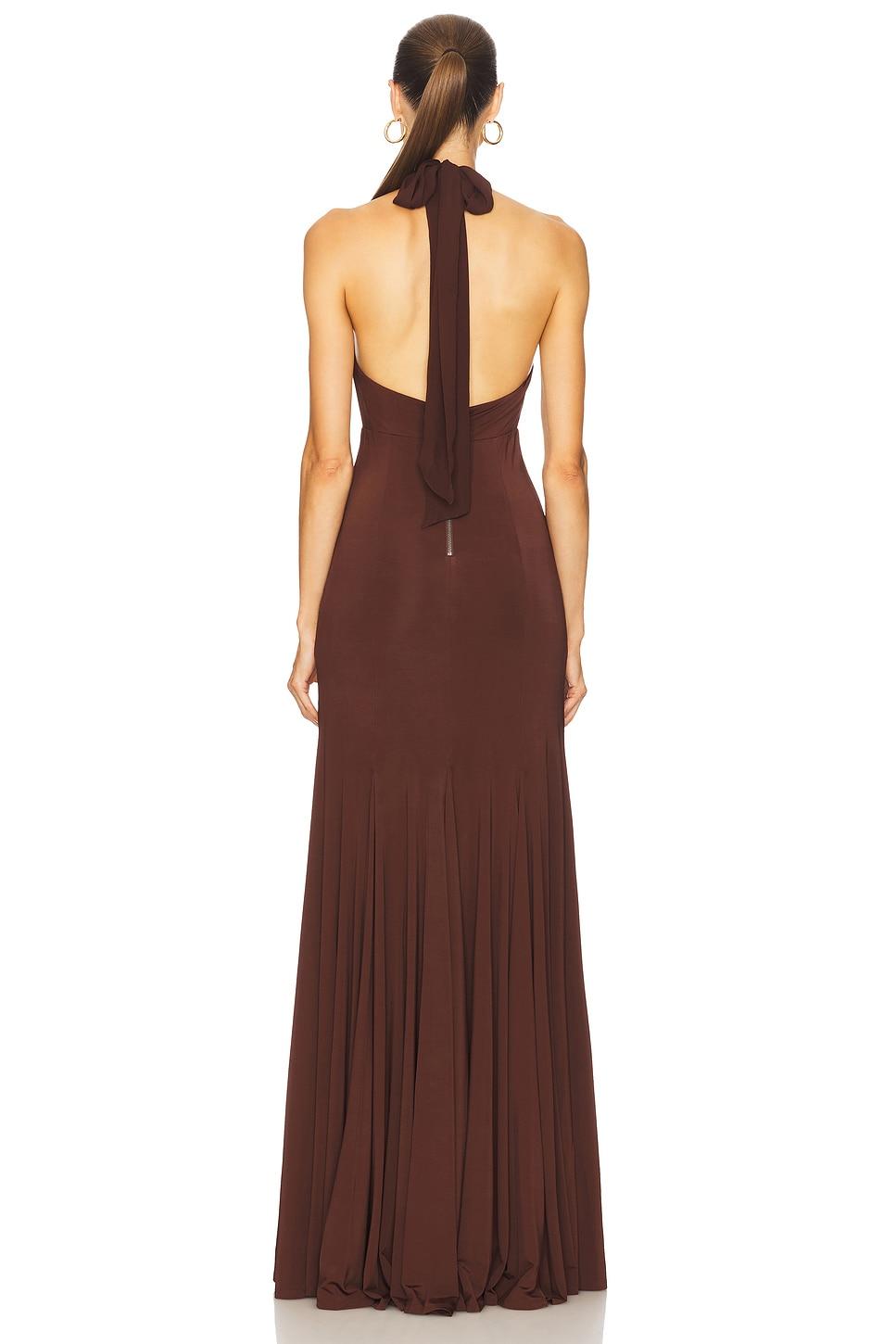 Self: 90% viscose, 10% elastaneLining 1: 85% nylon, 15% elastaneLining 2: 95% recycled polyester, 5% elastane. Dry clean only. Partially lined. Hidden back zipper closure. Halterneck styling with tie detail. Front cut-out detail. Midweight slinky jersey fabric. Made in China. Revolve Style No. ALI-WD1206. Manufacturer Style No. CG506V83508.
