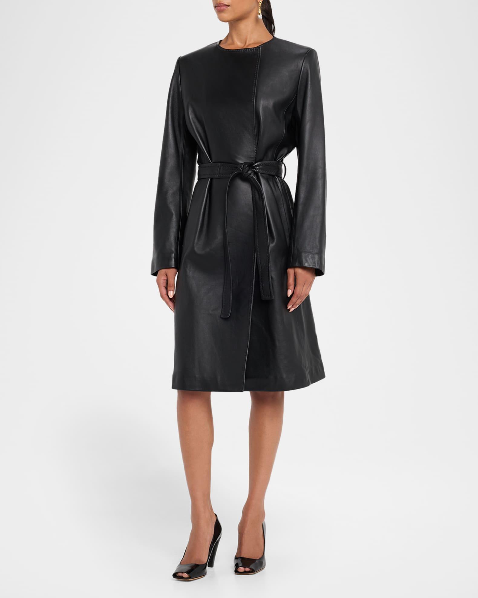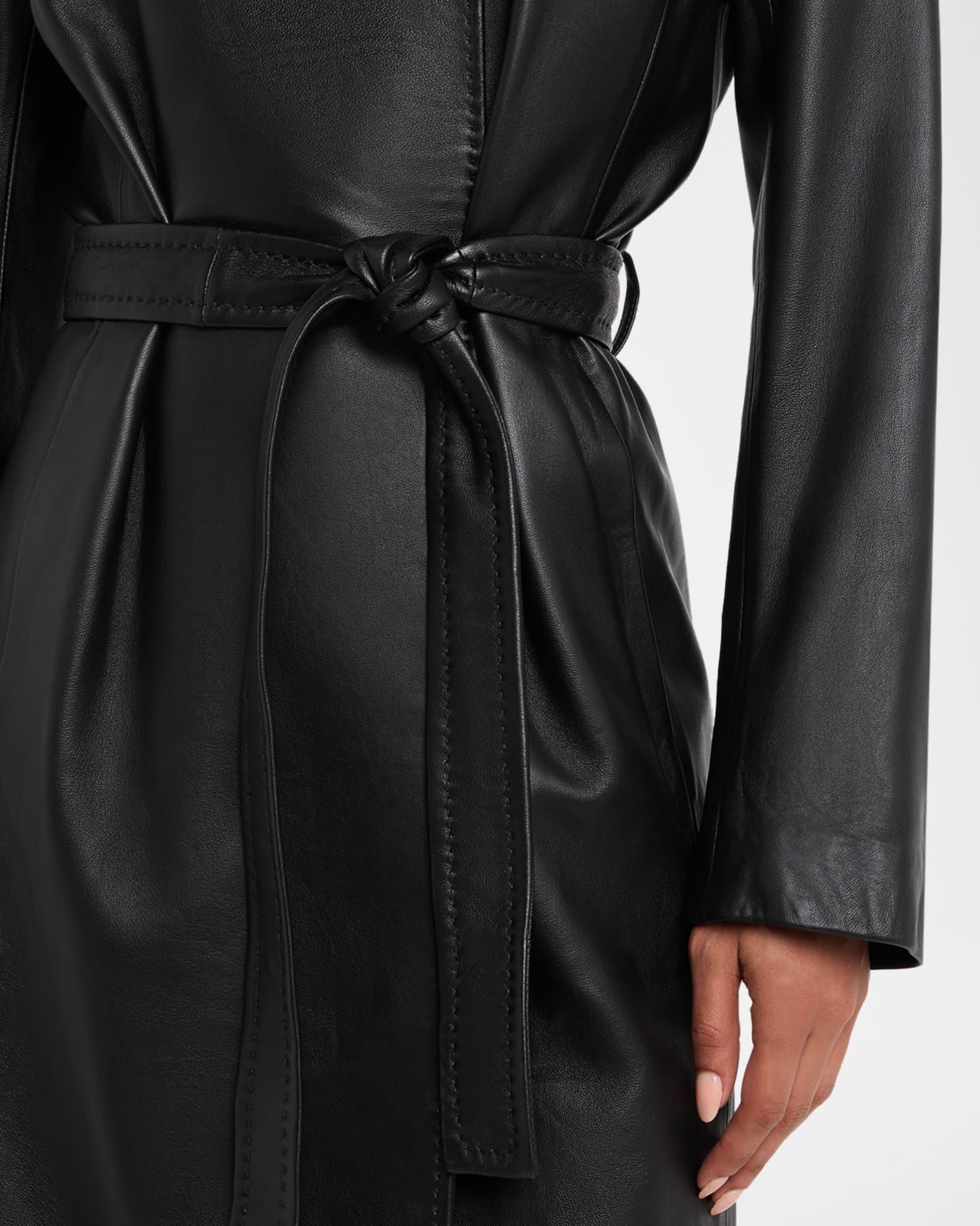 The "Evelyn" wrap coat by Fleurette is crafted from supple lambskin leather and finished with delicate pick-stitching for a touch of sophistication Round neckline; asymmetric snap-front Long sleeves Removable self-tie belt Side seam pockets Classic fit Hem hits around the knee Center back vent Leather Lining: Polyester Professional cleaning recommended Imported