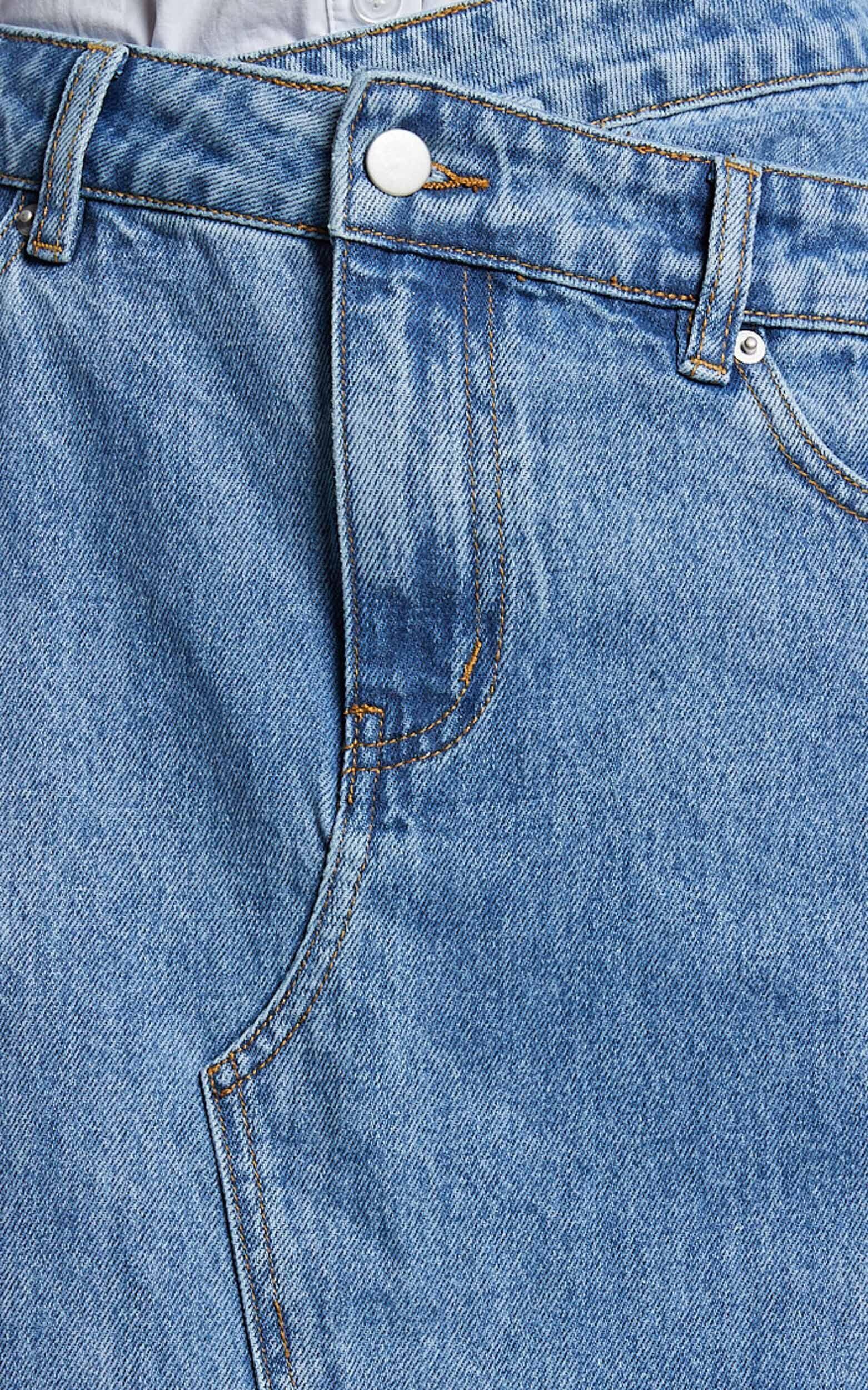 Get ready to turn heads in the Evelyn Maxi Skirt! This high asymmetrical waist denim skirt is a must-have addition to your casual wardrobe. With its frayed hem and mid blue wash, this skirt exudes effortless style. Made from 100% cotton denim, it offers both comfort and durability. Whether you're heading out for brunch with friends or strolling along the beach, this maxi skirt will keep you looking chic all day long. Pair it with a crop top and sandals for an easy summer outfit that's sure to make a statement.Product Details:Zips, Buttons, PocketsDenim SkirtsCasual MaxiMid WaistSize and FitSize S / 8 length: 102cm / 40.16inMaterial and CareMain Fabric: 50% Recycled Cotton, 50% CottonNo Stretch