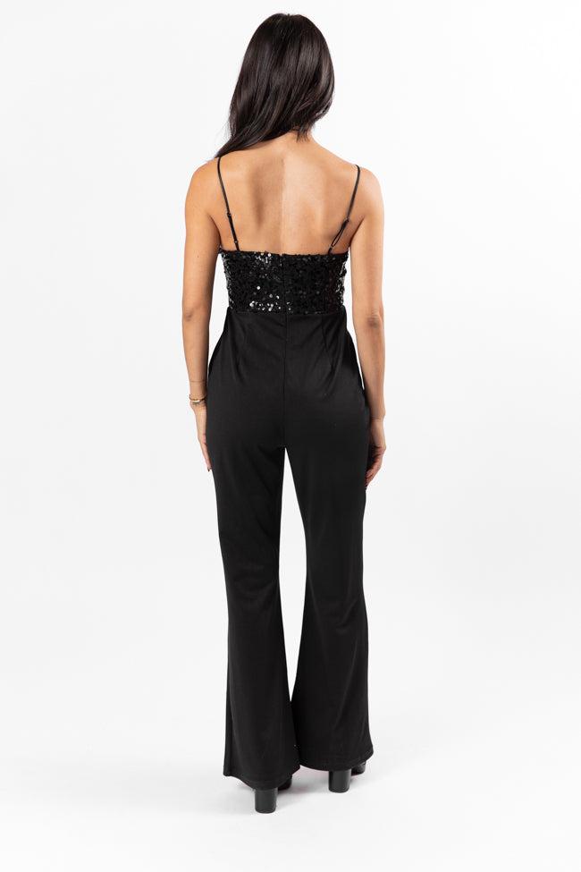 Details Black Sequin Top Jumpsuit Fabric has stretch Adjustable straps, sequin bust, back zipper closure, non-slip neckline Lined in top of bust only Size small inseam: 30" Material and Care Top: 100% polyester, bottom: 95% polyester 5% elastane Hand wash cold, line dry Patterns may vary Materials may have natural variations Colors may vary from different viewing devices.