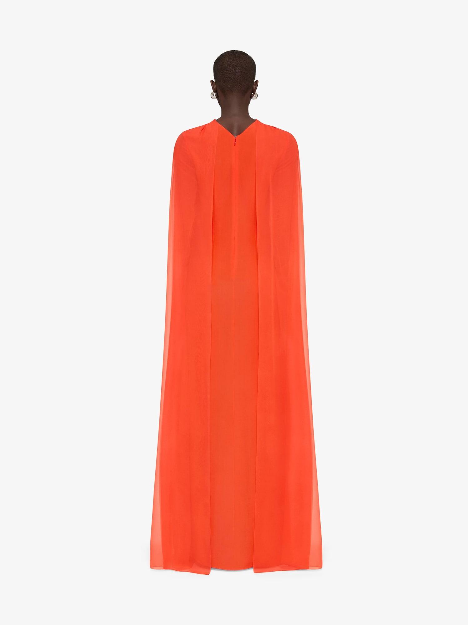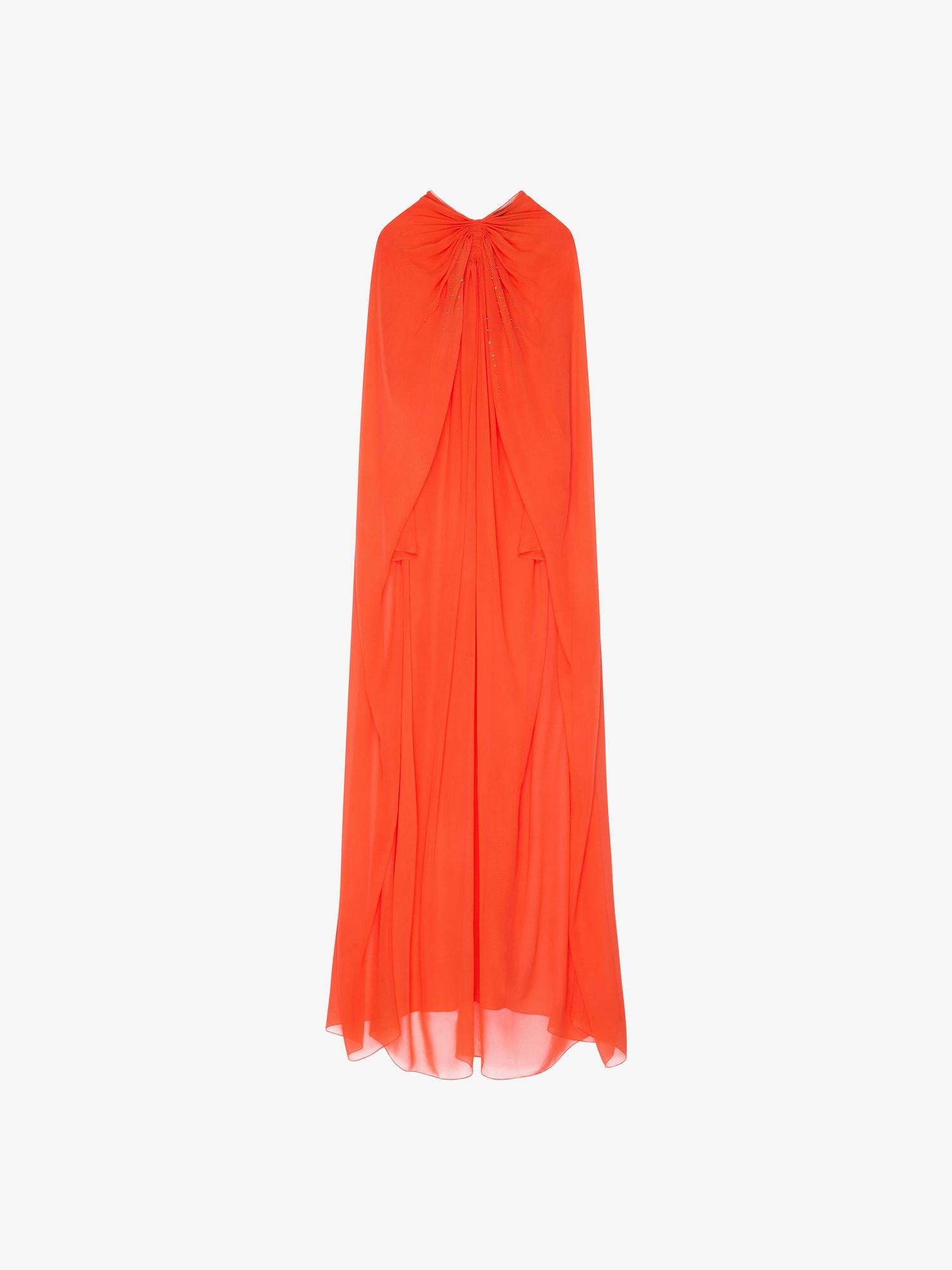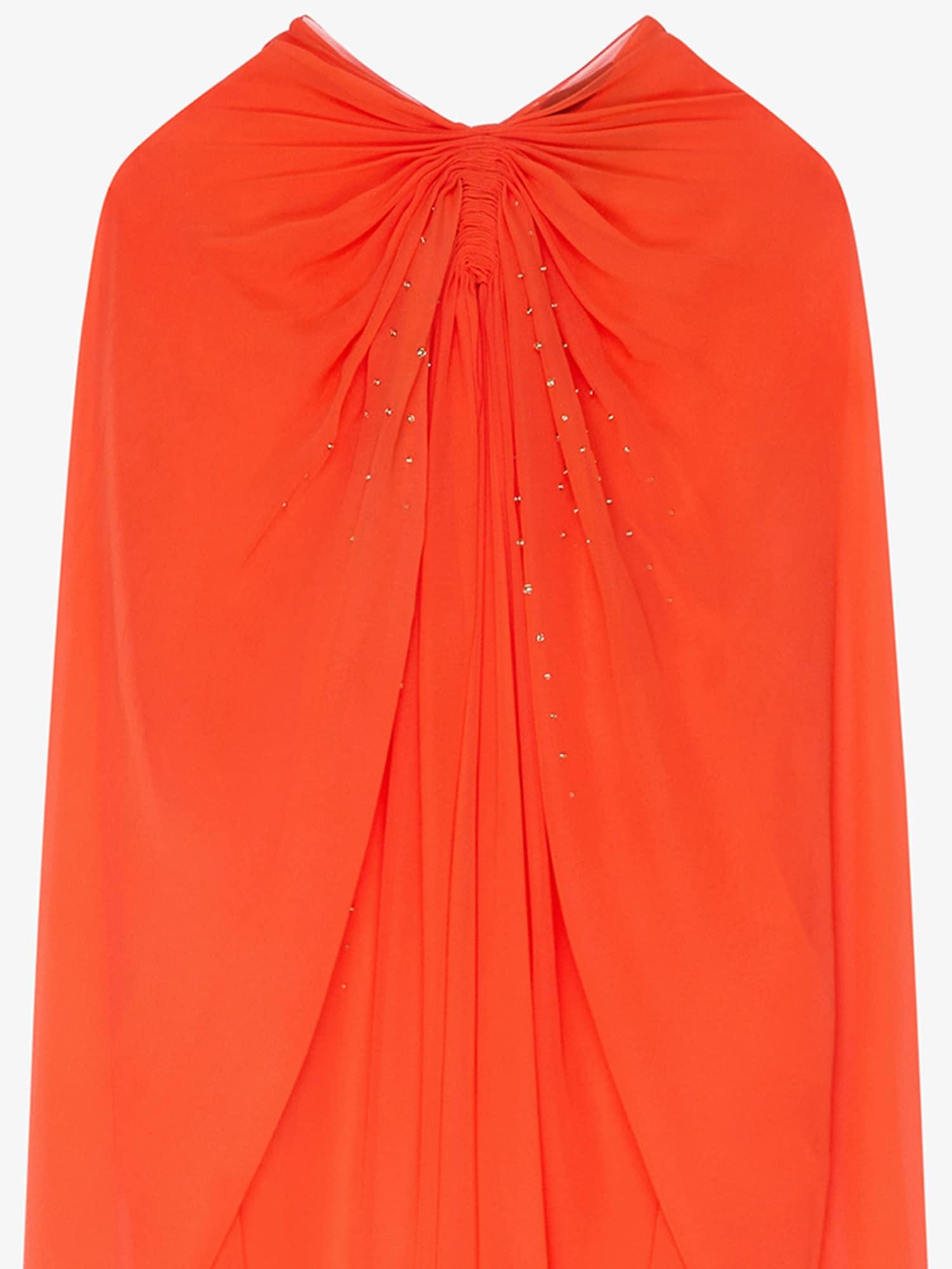 Continuing the spirit of last seasons, fluidity is a main focus of the collection. Evening dresses embrace transparency and draping, creating a spontaneous yet feminine silhouette. Long evening cape dress in silk georgette. Long sleeves. Golden pearls embroidered on the front. Draped on the front. Invisible zipped closure in the back. Opaque lining. Model measures 5.8 Feet and wears a size 36.