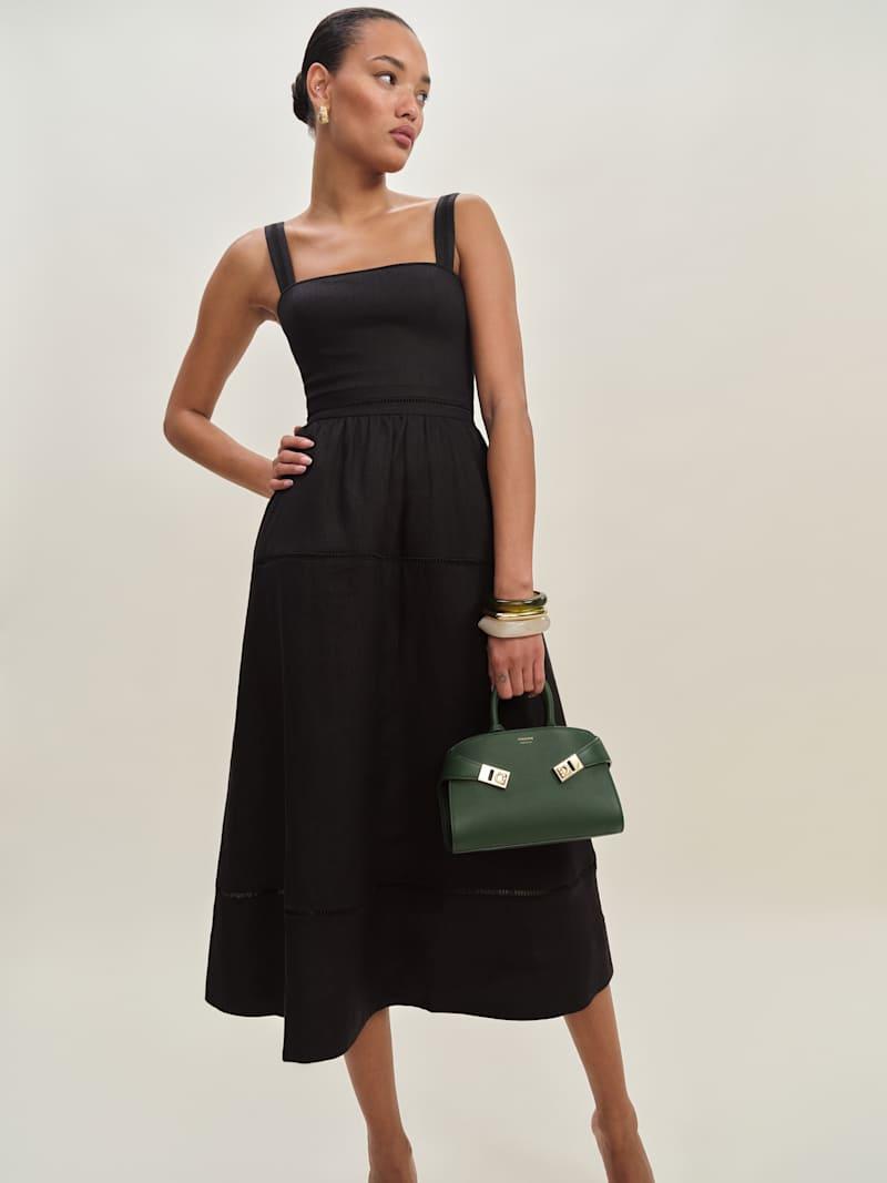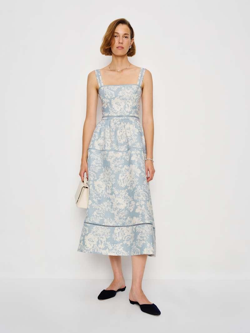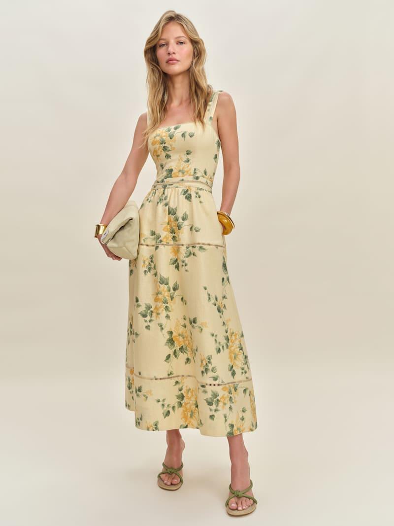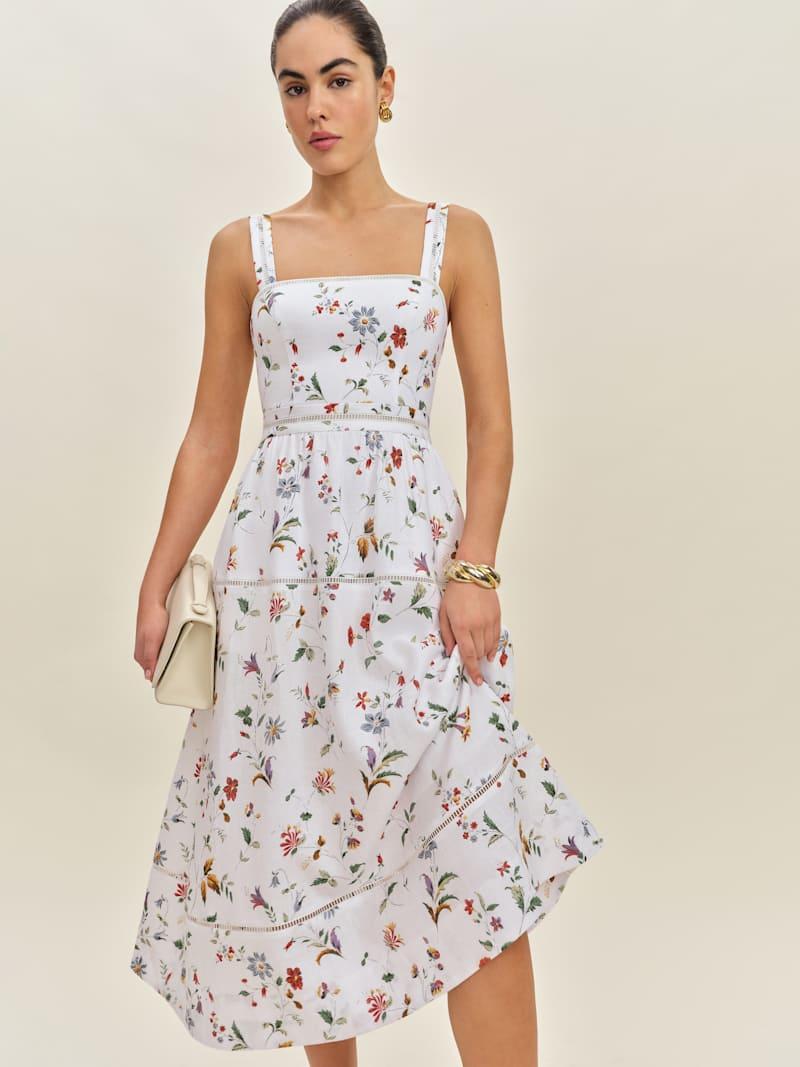 Wear me. Shop the Everett Linen Dress from Reformation, a sleeveless midi dress with a square neckline, fitted bust, relaxed skirt, and embroidery detailing.