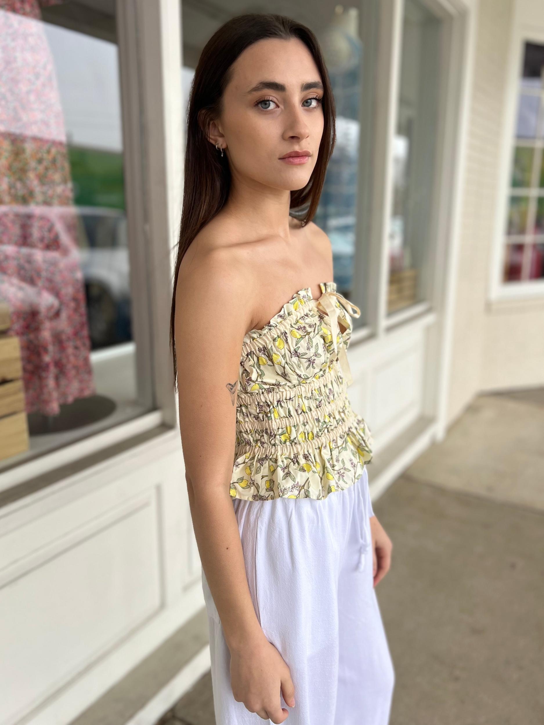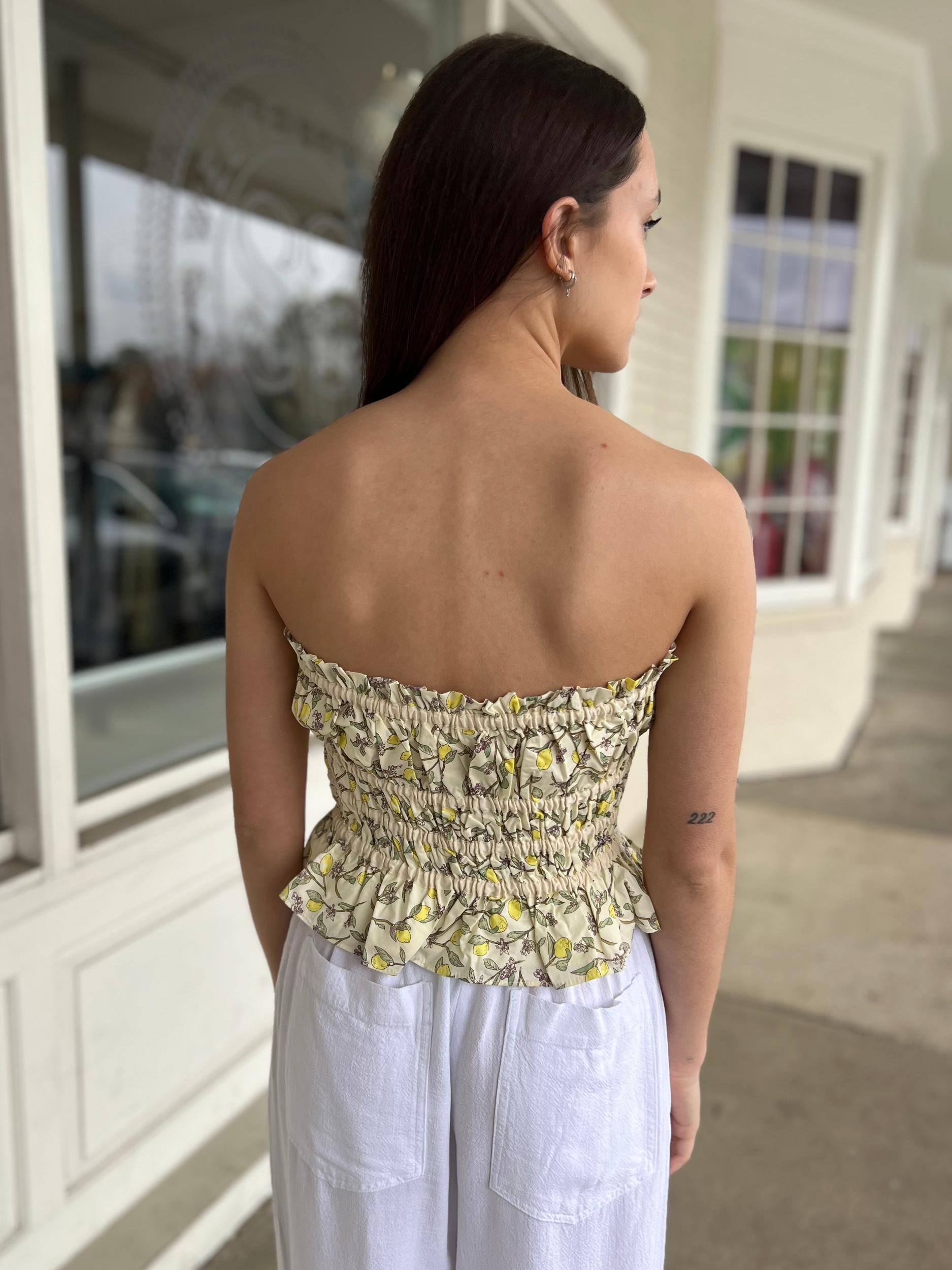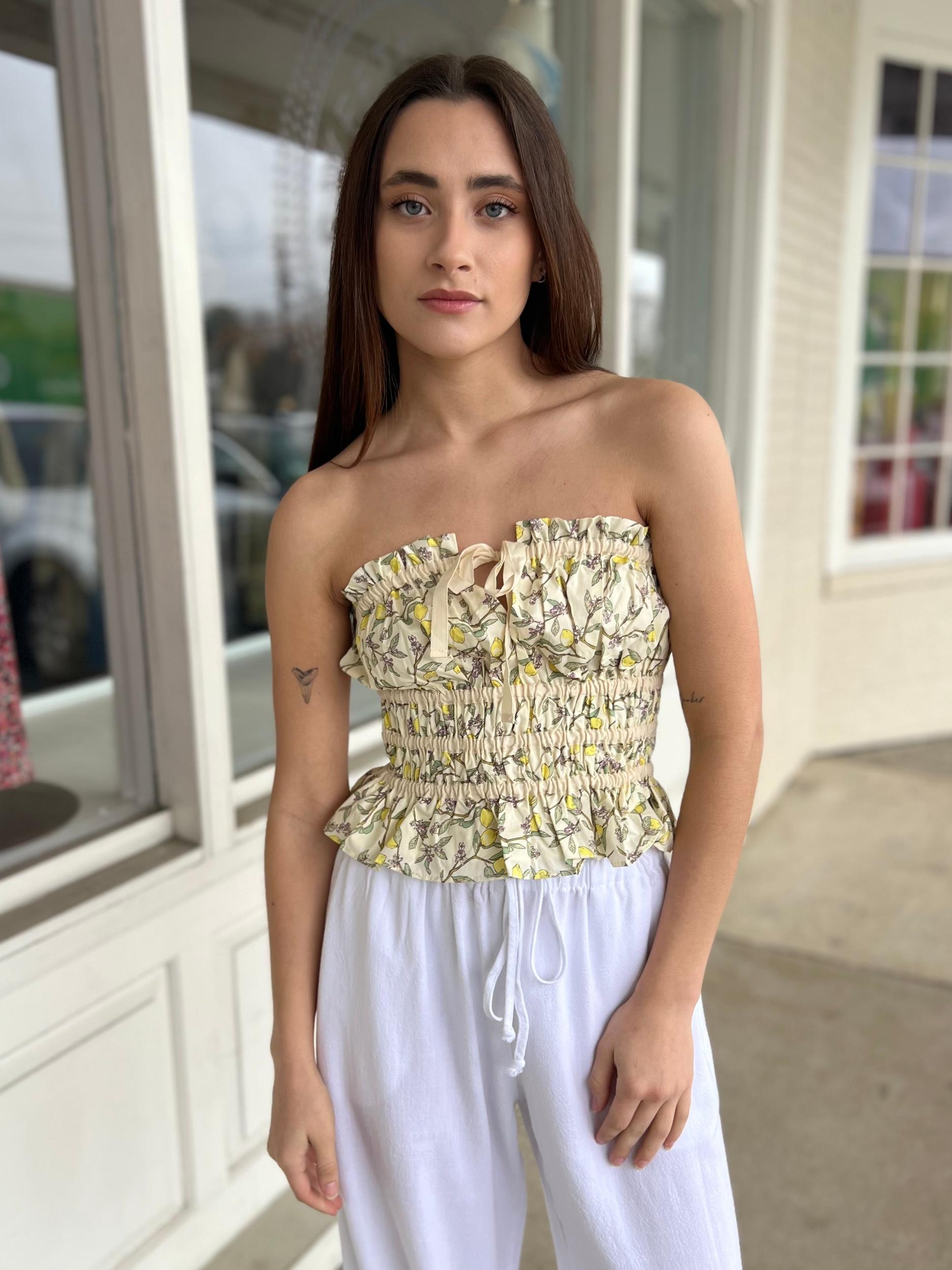 Get ready to turn heads in our Everland Tube Top! This cream strapless top features a playful lemon floral print and a self tie at the bust with a cute ribbon detail. The flirty peplum hem adds an extra touch of style. Perfect for a day out or a night on the town!