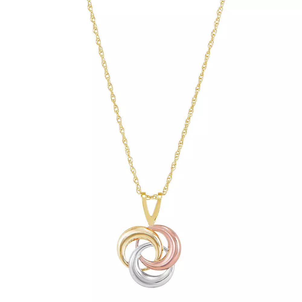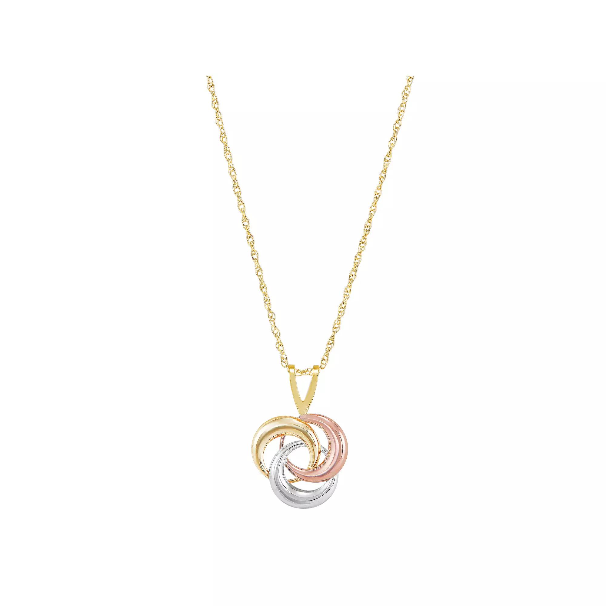 Celebrate love with this Everlasting Gold 10k tri-tone gold love knot drop pendant necklace. Featuring intertwined gold hues, it symbolizes unity and style in one elegant design. Click on this JEWELRY & WATCHES GUIDE to learn about fit, styles, materials and more! Celebrate love with this Everlasting Gold 10k tri-tone gold love knot drop pendant necklace. Featuring intertwined gold hues, it symbolizes unity and style in one elegant design. Click on this JEWELRY & WATCHES GUIDE to learn about fit, styles, materials and more! FEATURES 3/5L x 2/5W Chain length: 18 in. Chain type: lightweight rope Clasp: spring-ring Metal: 10k gold, 10k rose gold, 10k white gold Finish: polished Packaging: boxed Size: 18. Color: 10k Tone. Gender: female. Age Group: adult.