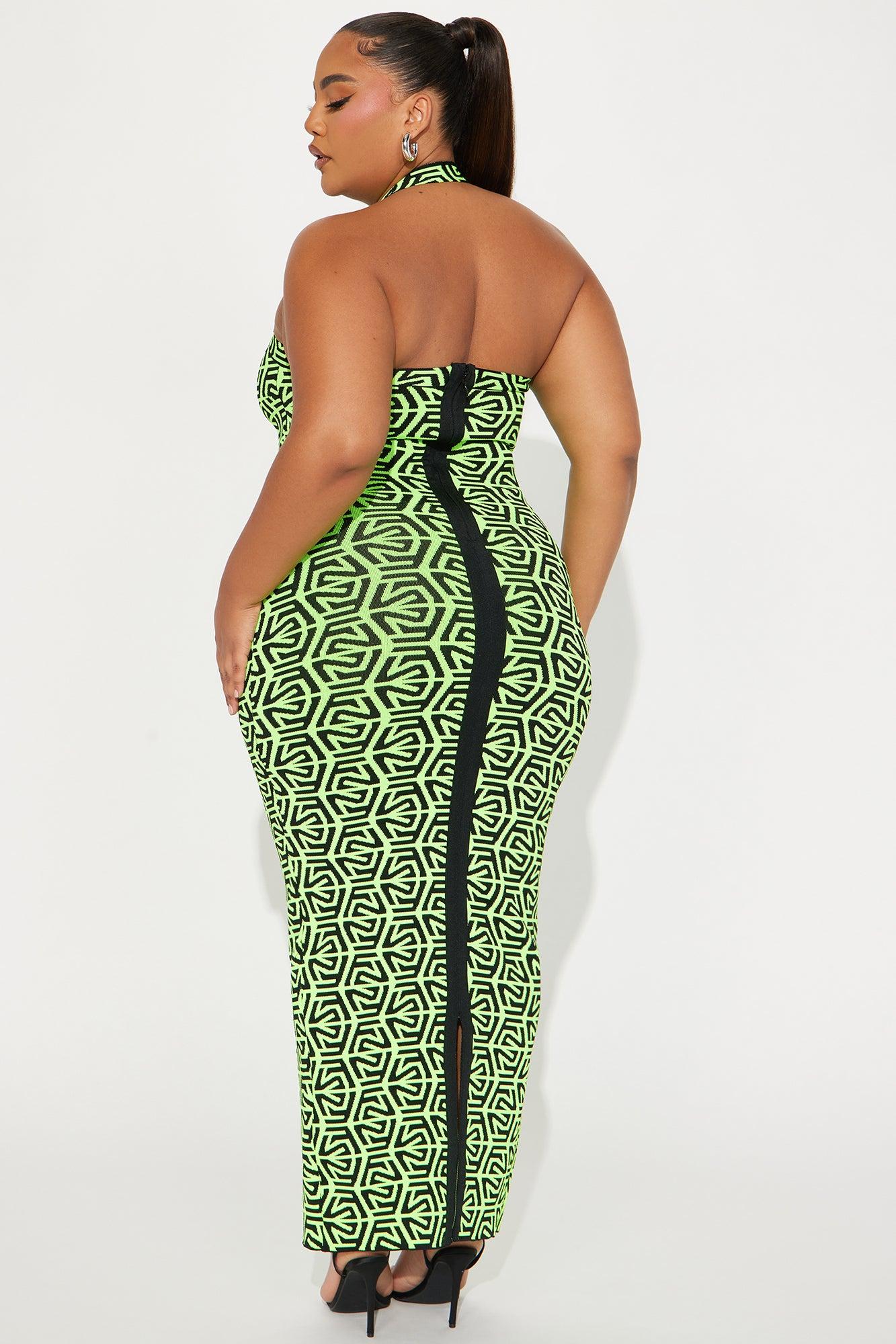 Available In Lime. Sweater Maxi Dress Halter Back Zipper Closure Stretch Disclaimer Pattern Placement May Vary 90% Polyester 10% Spandex Imported