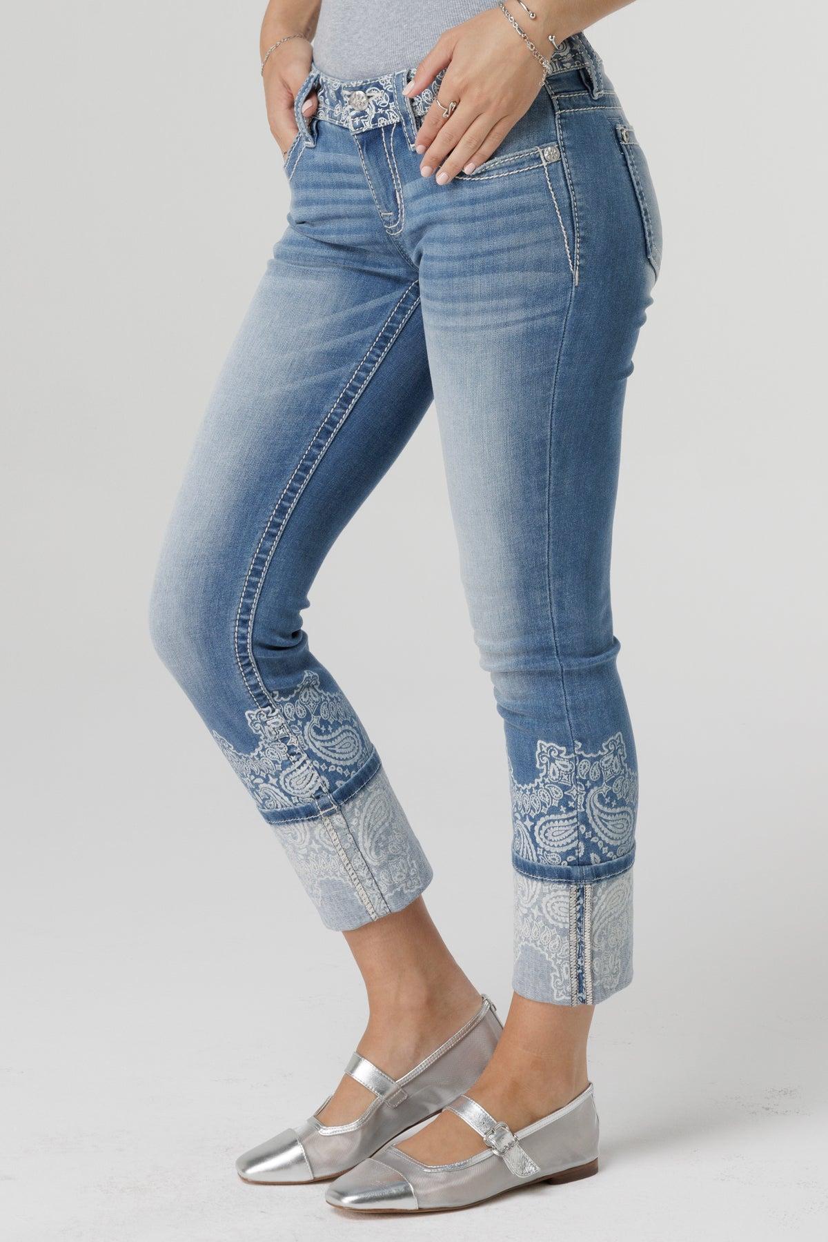 Mid-rise, light-wash cropped straight jeans- Simple stitched border with winged M logo on back pocket design - Novelty paisley design on yoke and cropped jean bottom - 5-pocket design- Slight fading Model is wearing size: 25Model Measurements:Height: 5'9" Bust: 32" Waist: 26"Hips: 25" Fabric Content: 80% Cotton, 12% Polyester, 6% Rayon, 2% Spandex Care: Gentle machine wash inside-out with like colors in cold water. Tumble dry low. Style No. M3636CT89-L282