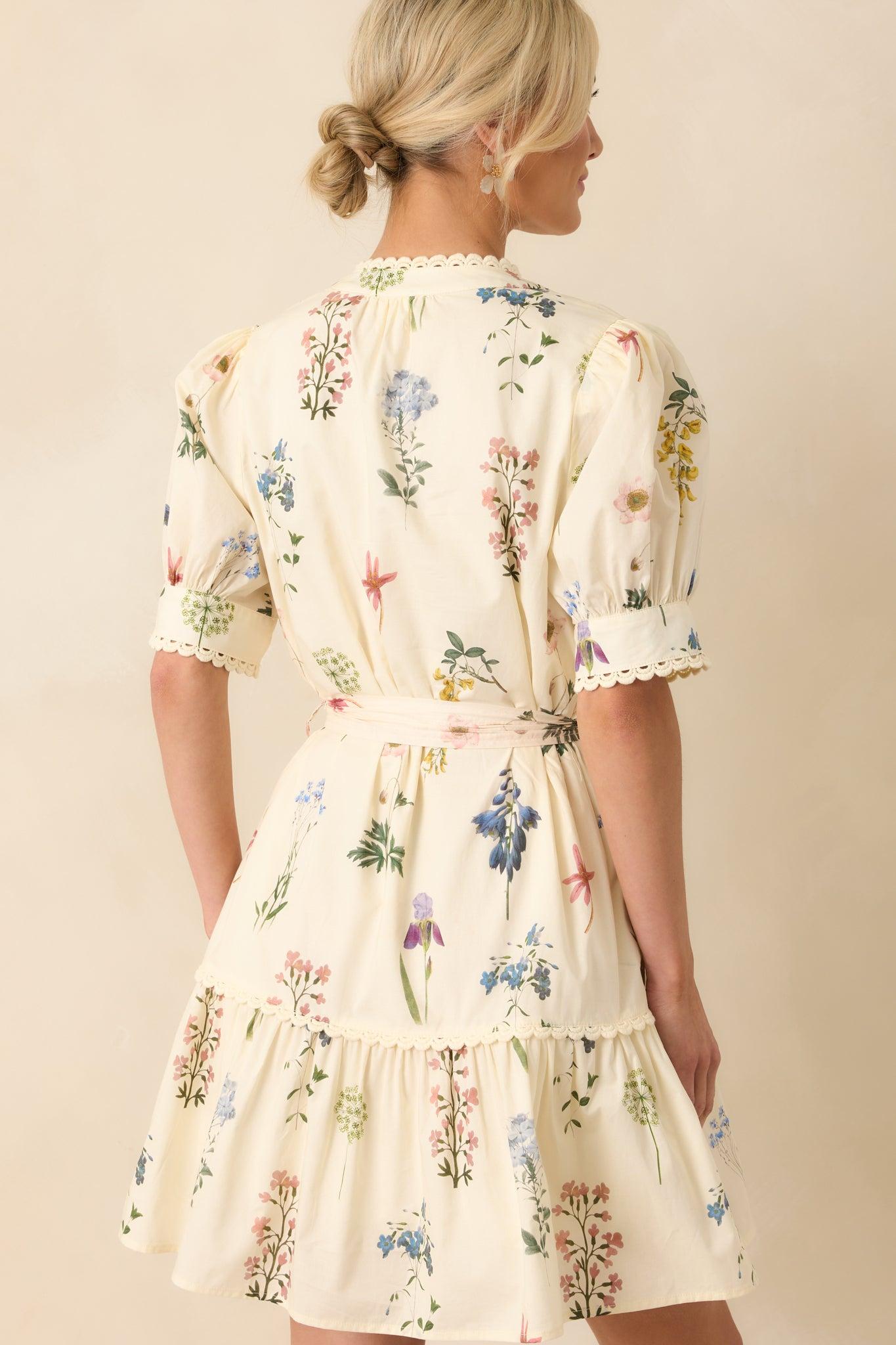 The Everything Is Just Right Ivory Floral Print Cotton Mini Dress is made for the days that fall into place effortlessly. Lighthearted and charming, it’s the kind of piece that feels easy, natural, and entirely right. This ivory mini dress features a multicolor floral print throughout, a notch v-neckline, short puff sleeves, optional self-tie belt, ivory embroidered scallop trim details, ivory lining, and functional pockets.