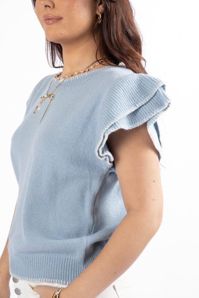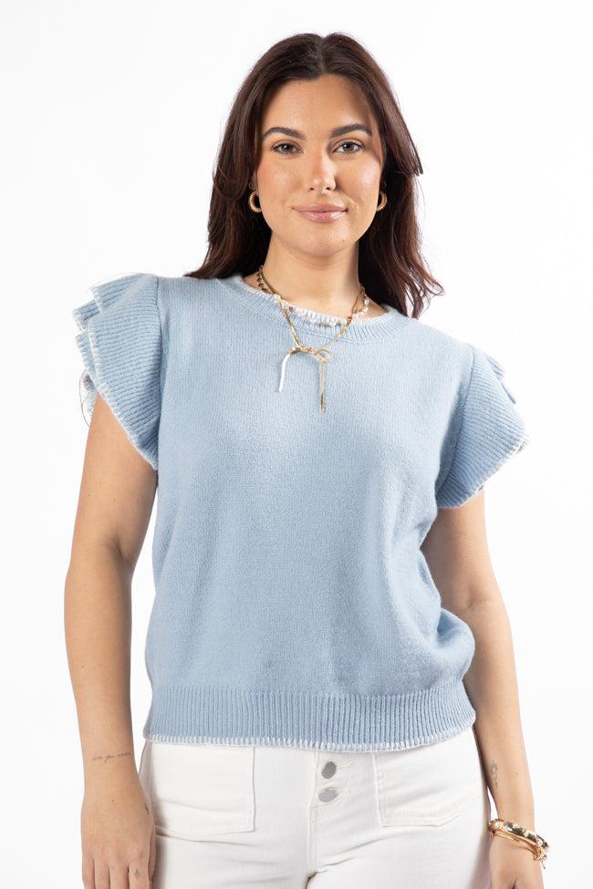 Details Flutter Sleeve Stitched Detail Sweater Light Blue Fabric has stretch Crew neckline, flutter sleeves, embroidered hem, ribbed hem Unlined Size small from shoulder to hem: 21.5" Material and Care 39% acrylic 31% polyester 30% nylon Hand wash cold, lay flat to dry Patterns may vary Materials may have natural variations Colors may vary from different viewing devices.