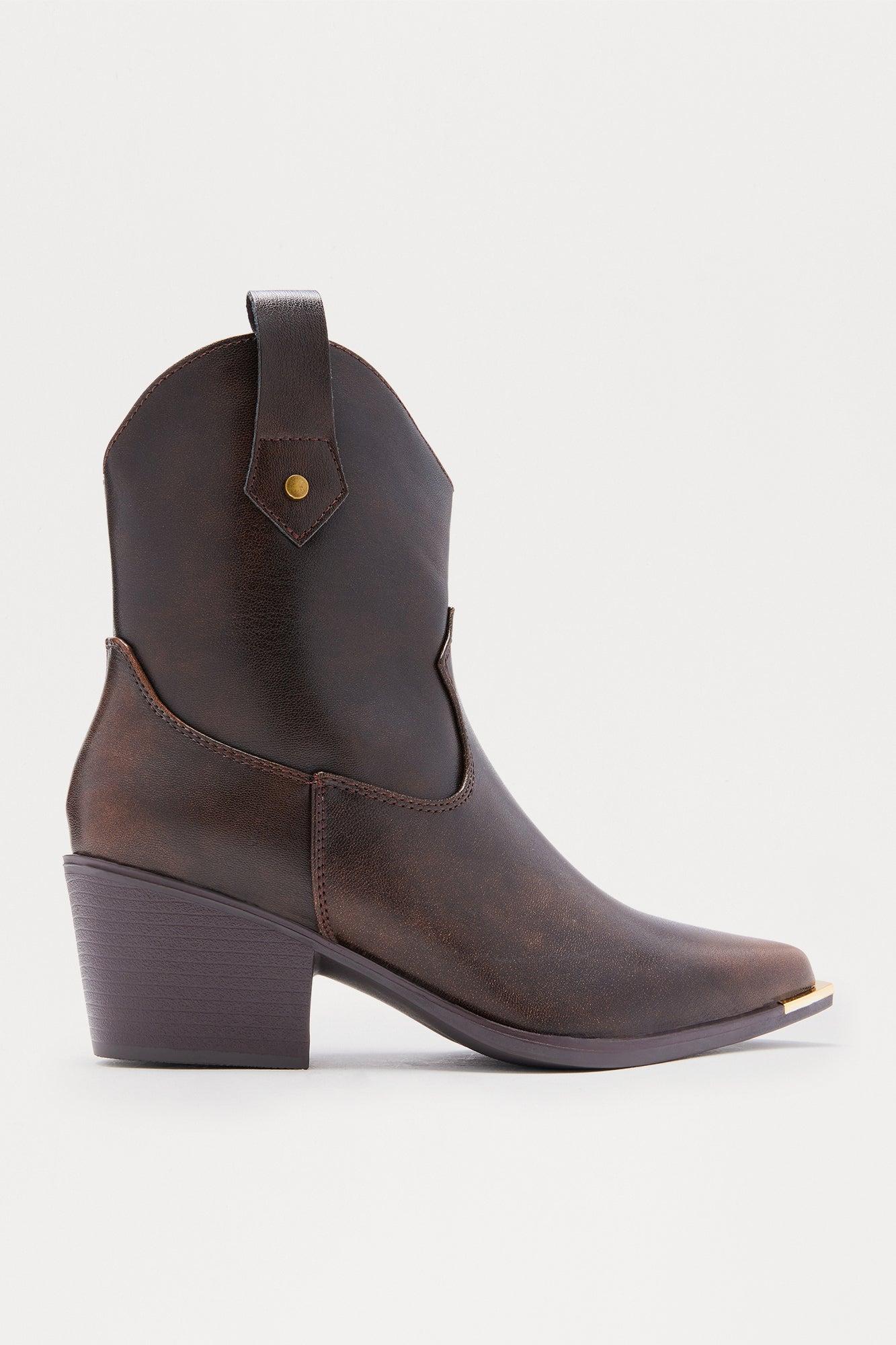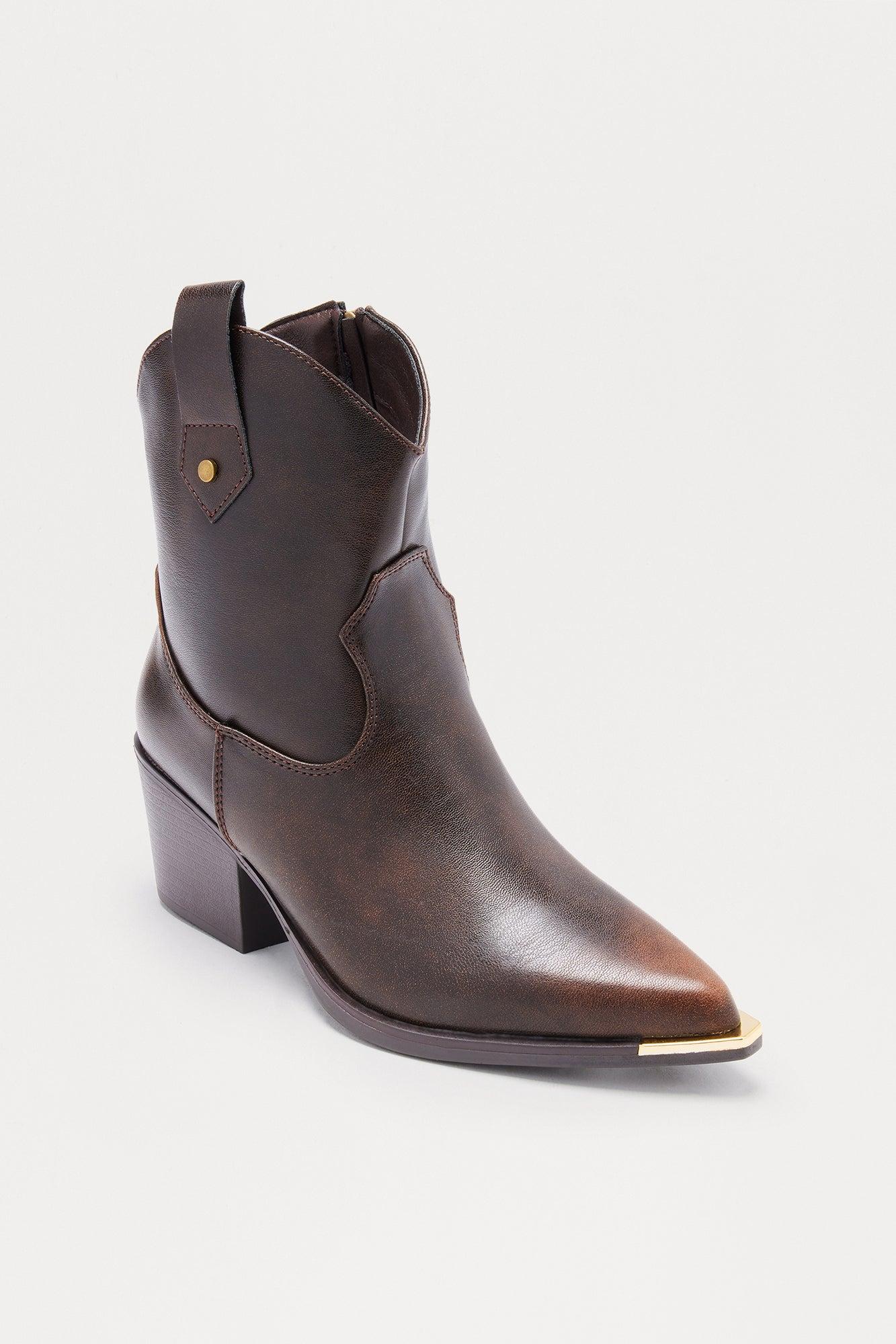 Available In Black And Brown. Cowboy Booties Pointed Toe 2.5" Mid Block Heel Imported California Proposition 65WARNING: Cancer and Reproductive Harm - www.P65Warnings.ca.gov.