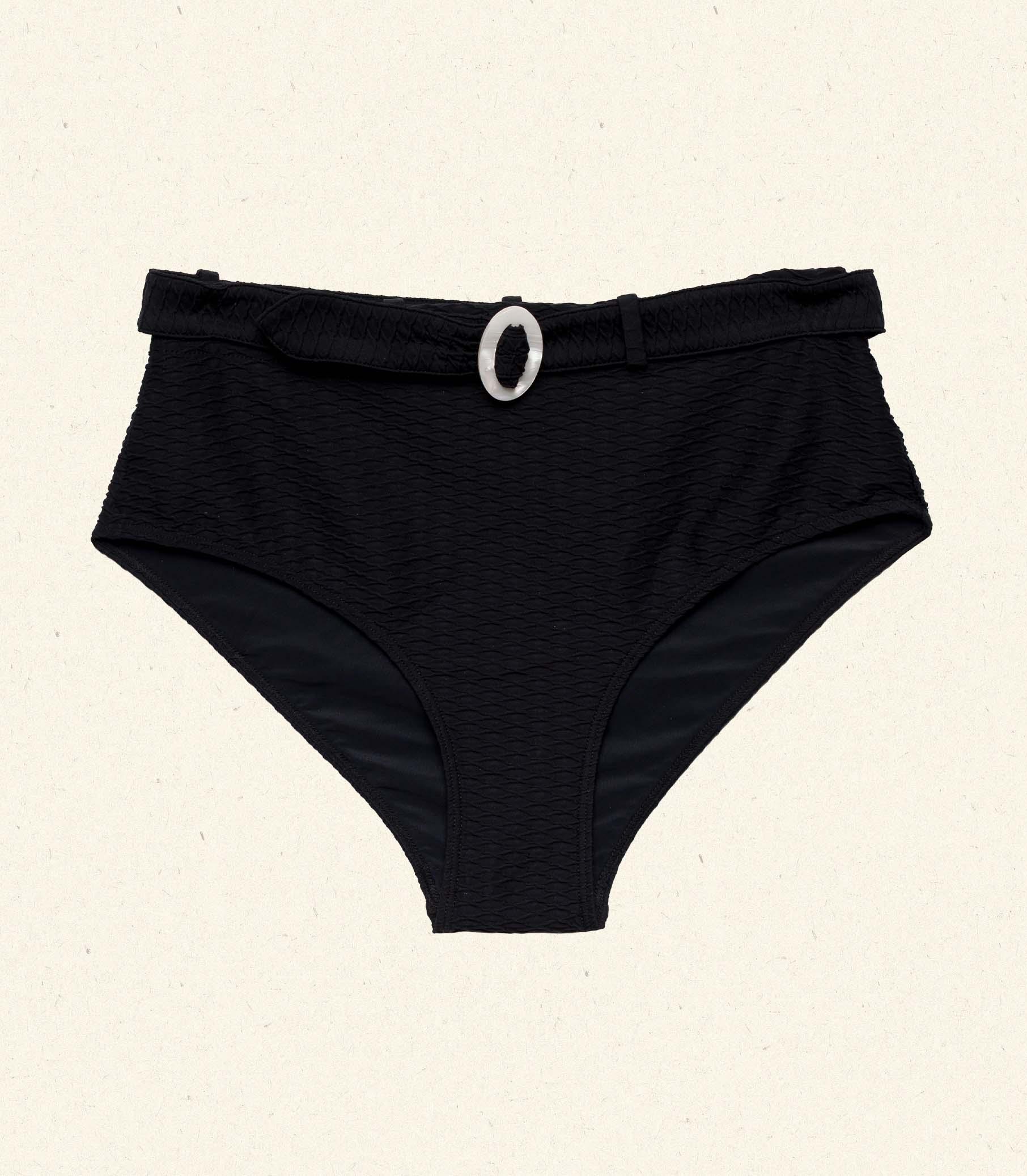 Inspired by 1960s swimwear, the Evora Bikini Bottom features a high-rise waist and medium-coverage cut. Crafted from a stretchy, honeycomb texture swim fabric and fully lined, it’s finished with a functional belt and faux mother-of-pearl buckle, plus zigzag stitching along the edges.