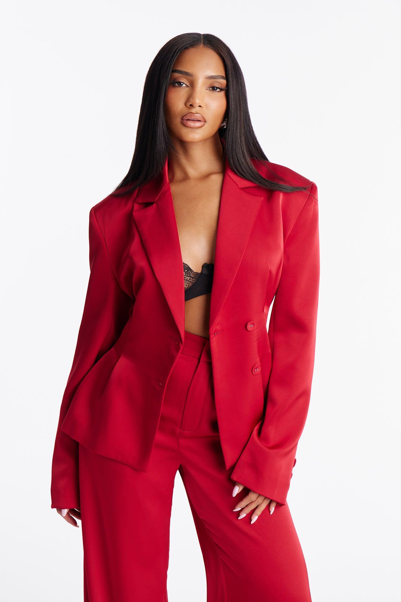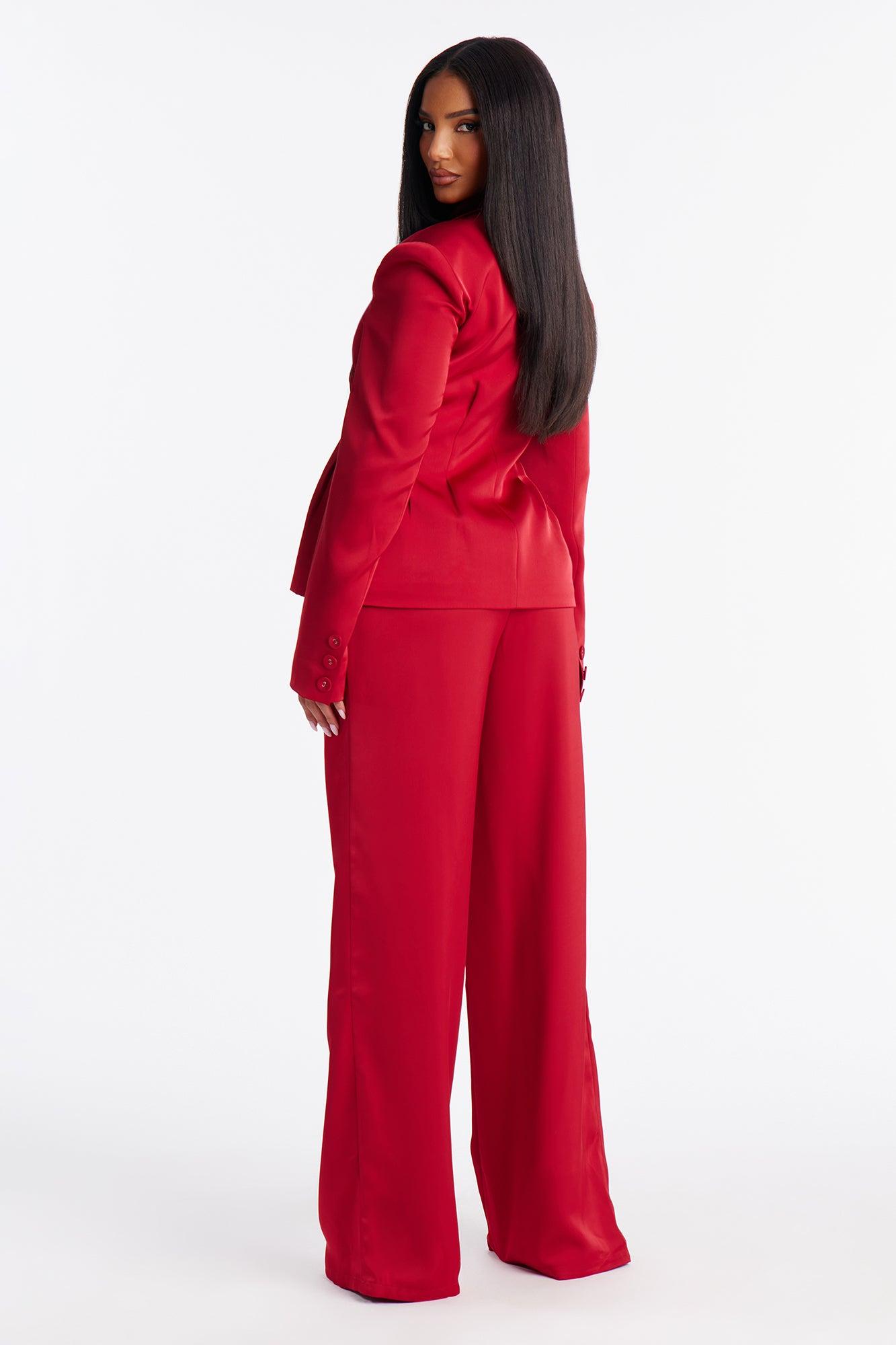 Available In Red. 2 Piece Ensemble Button Up Blazer And Wide Leg Pant Set Moderate Stretch Shoulder Pads Lined Blazer Front Closure With Fly Zipper On Pants Inseam 34" Self: 100% Polyester Lining: 100% Polyester Imported