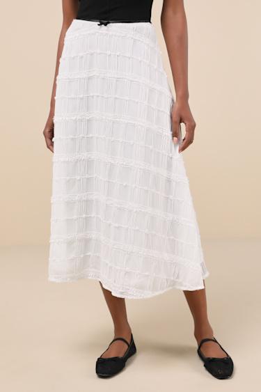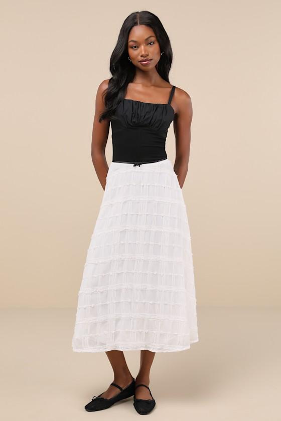 Your style skills will be well known when everyone sees you strutting in the Lulus Expert Sweetness White Textured A-Line Midi Skirt! This gauzy, woven chiffon skirt features pleated, fuzzy, and Lurex-threaded details that create a textured, grid-like design across the ultra-flowy, A-line silhouette. Black satin trim and a dainty bow accent the high-rise waist, while a chic midi hem completes the too-cute design! Hidden back zipper/clasp.