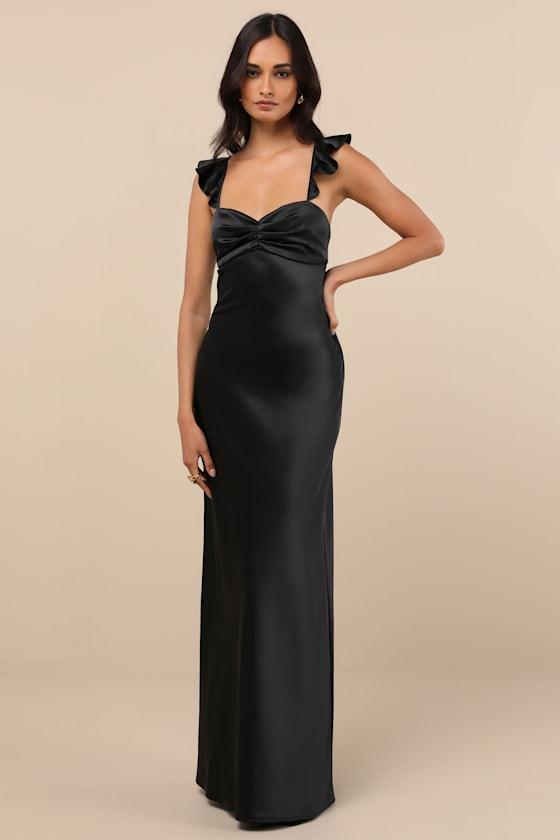 The Lulus Exuberant Luxury Black Satin Ruffled Lace-Up Maxi Dress was made for any special occasion that needs a sensational look to match! Sleek woven satin shapes this lovely dress that features a sleeveless bodice with a ruched detail at the center, creating chic pleating and a sweetheart neckline. Slender, ruffle-trimmed straps flow into a trendy lace-up design across an open back. The high, empire-style waist tops a figure-skimming, A-line skirt that cascades down to a sweeping maxi hem. Hidden back zipper/clasp.
