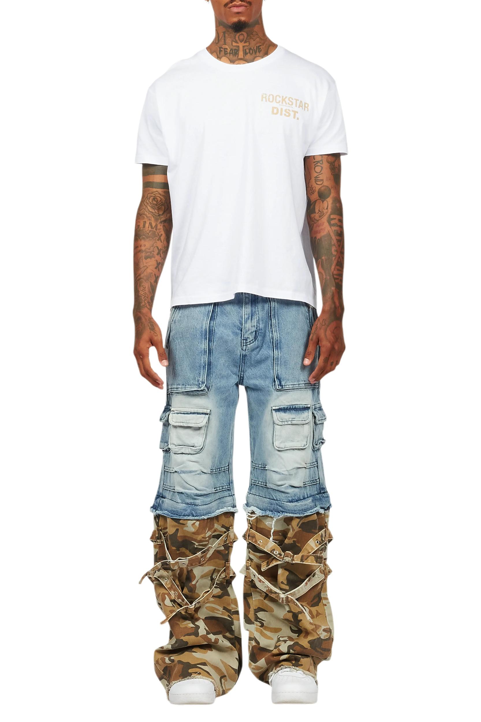 An urban baggy cargo jean for men in light blue. Designed with organic cotton and an oversized-fit for an essential streetwear style. Zip fly with button closure 8-pocket build Utility pockets Distressed detailing Buckle straps Parachute pant baggy construction
