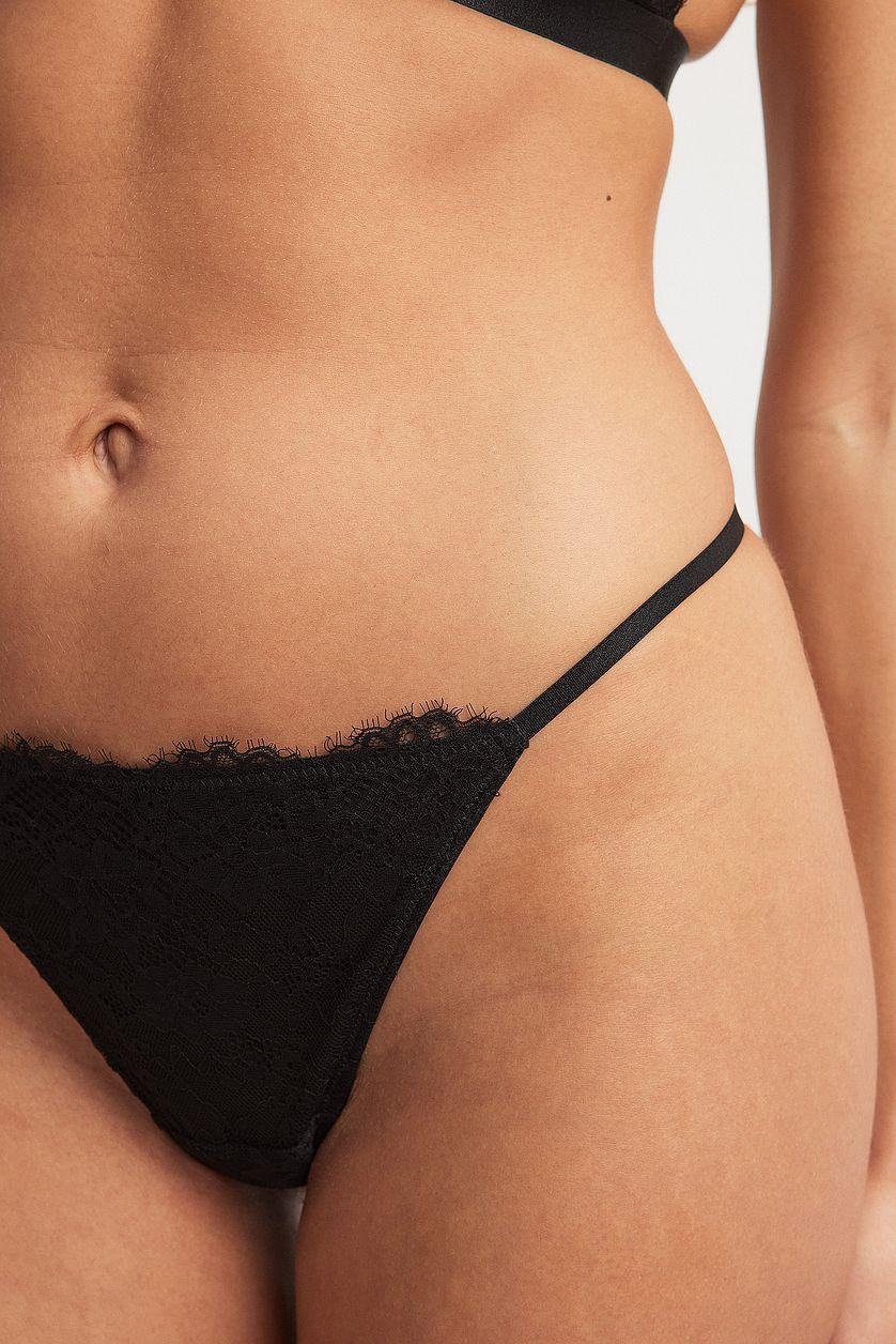 These panties feature a thong design and a lace layer. They have sheer mesh material and thin side straps. Our panties have a crotch lining.