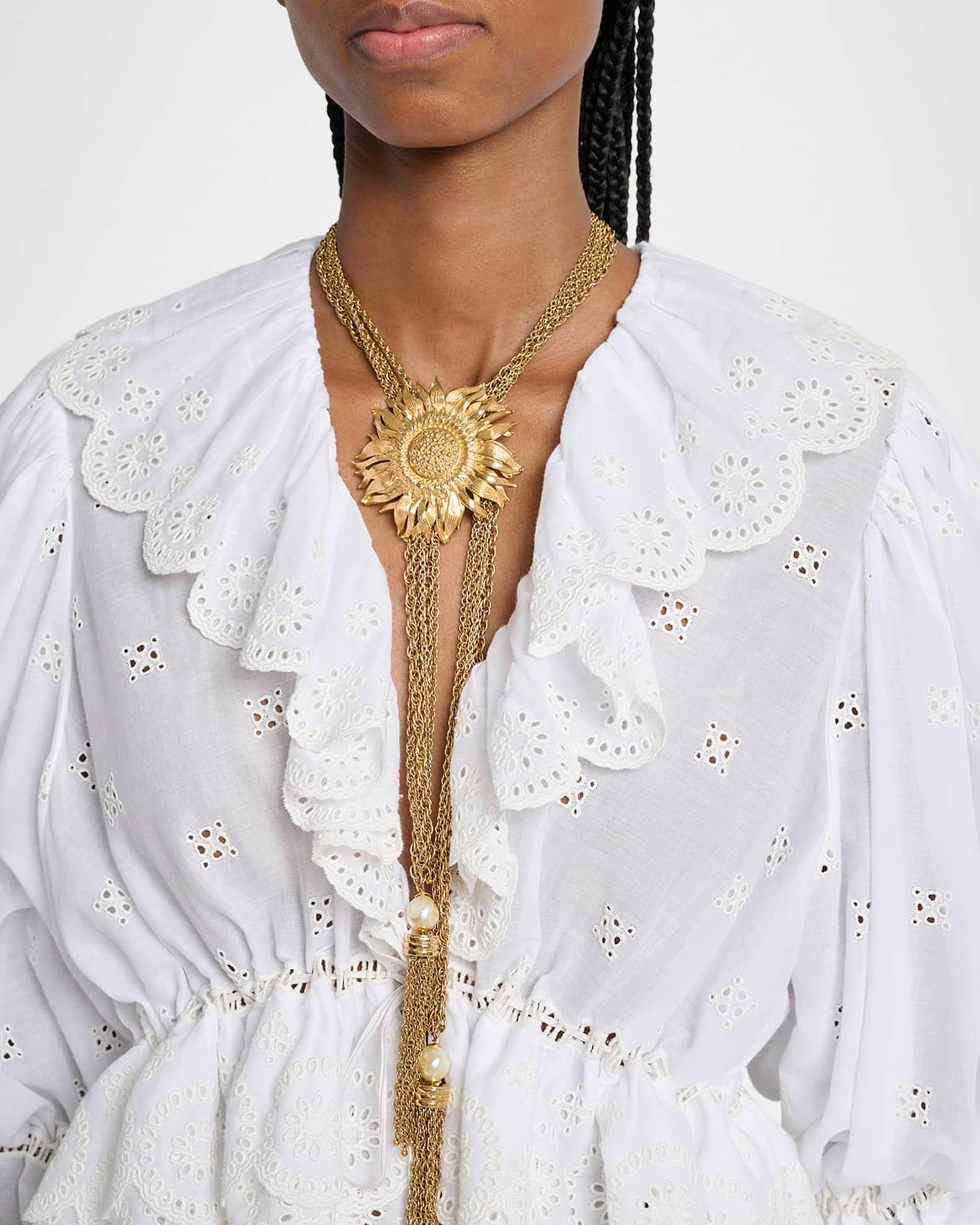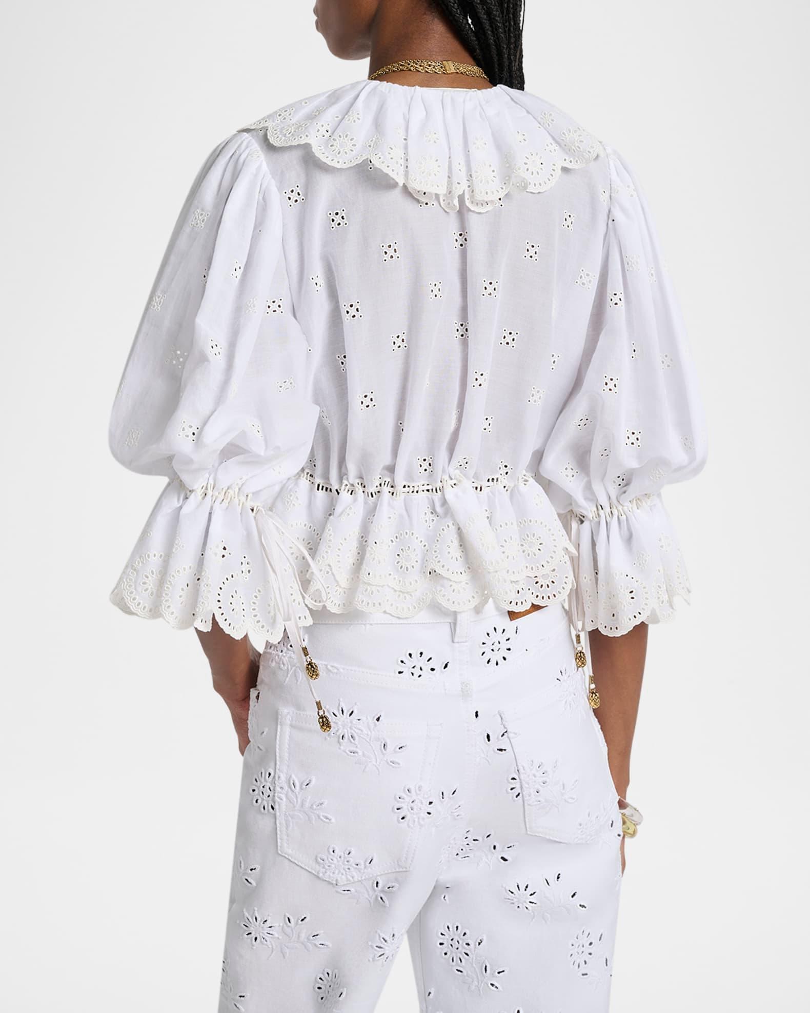 Chloe peasant blouse in eyelet embroidered cotton with scalloped ruffles and a drawstring cinched waist V neckline 3/4 blouson sleeves Self-tie ruffle cuffs Relaxed fit Cropped length Ruffle hem Self-tie front closure Cotton/polyester Dry clean Imported