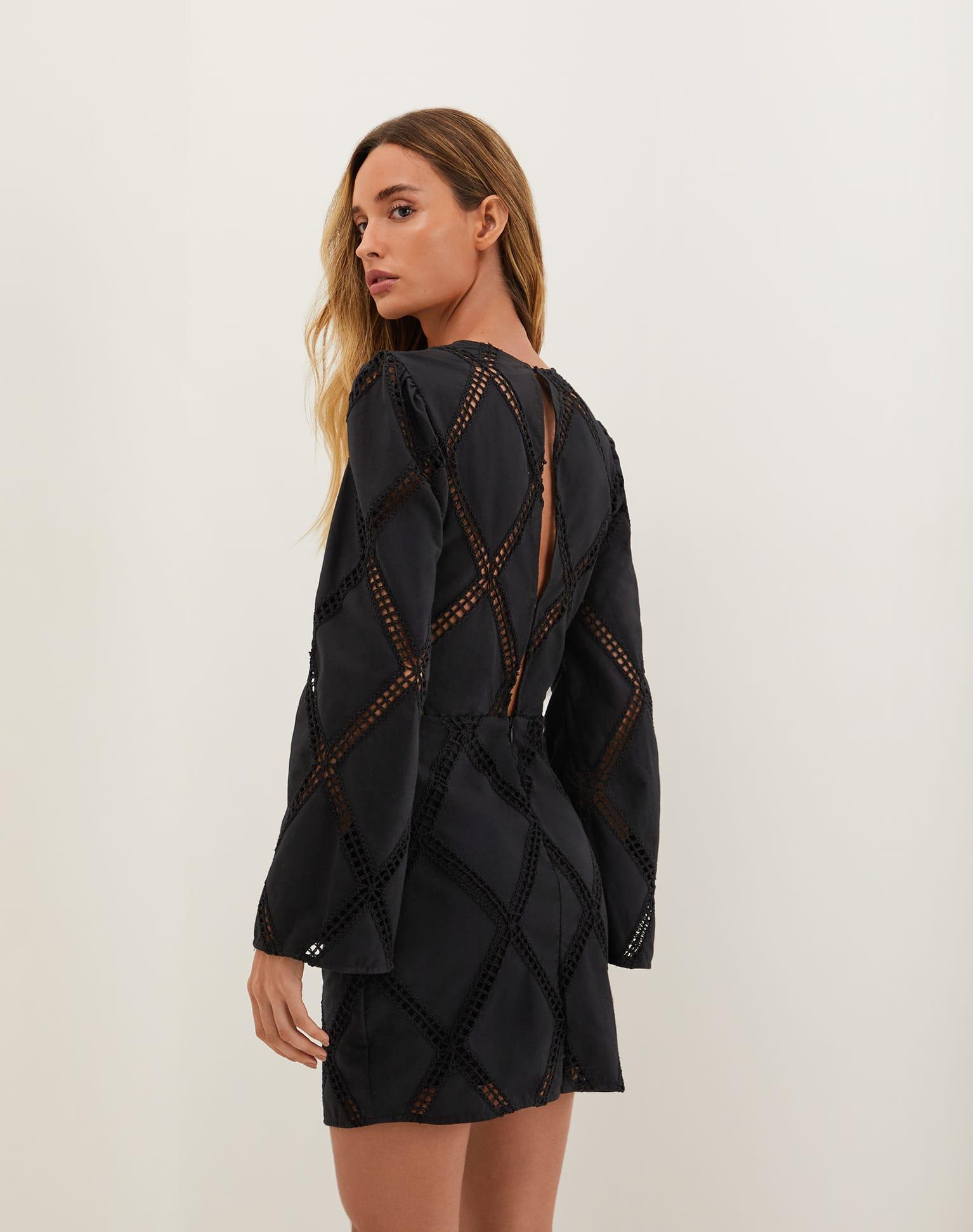 The ViX Eyelet Kaira Short Dress is a mini silhouette crafted from our eyelet fabric in a geometric crisscross pattern. It showcases a V-neckline, long flared sleeves, a bold cutout below the bust, and back closures. Style the Kaira Short Dress with sandals or heels and ViX accessories for a resort-ready look. Features