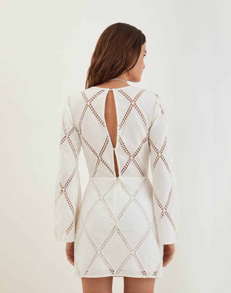 The ViX Eyelet Kaira Short Dress is a mini silhouette crafted from our eyelet fabric in a geometric crisscross pattern. It showcases a V-neckline, long flared sleeves, a bold cutout below the bust, and back closures. Style the Kaira Short Dress with sandals or heels and ViX accessories for a resort-ready look. Features