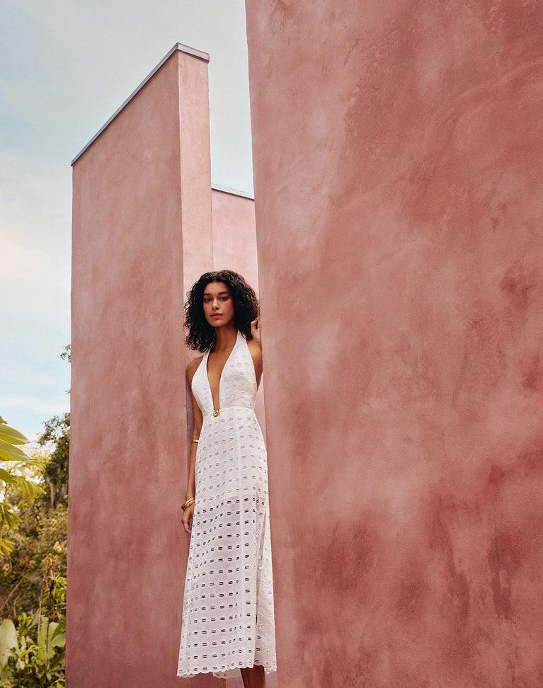 The ViX Eyelet Maryse Long Dress is a captivating maxi dress design that features a plunging V-neckline and an exposed open back, enhanced by tie closures at the neck for an adjustable fit. The gold-plated Kori detail at the bust adds a touch of sophistication, while the eyelet fabric offers subtle intrigue with its sl