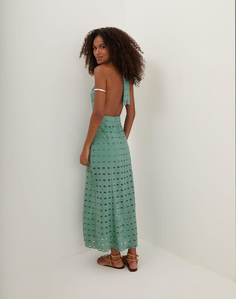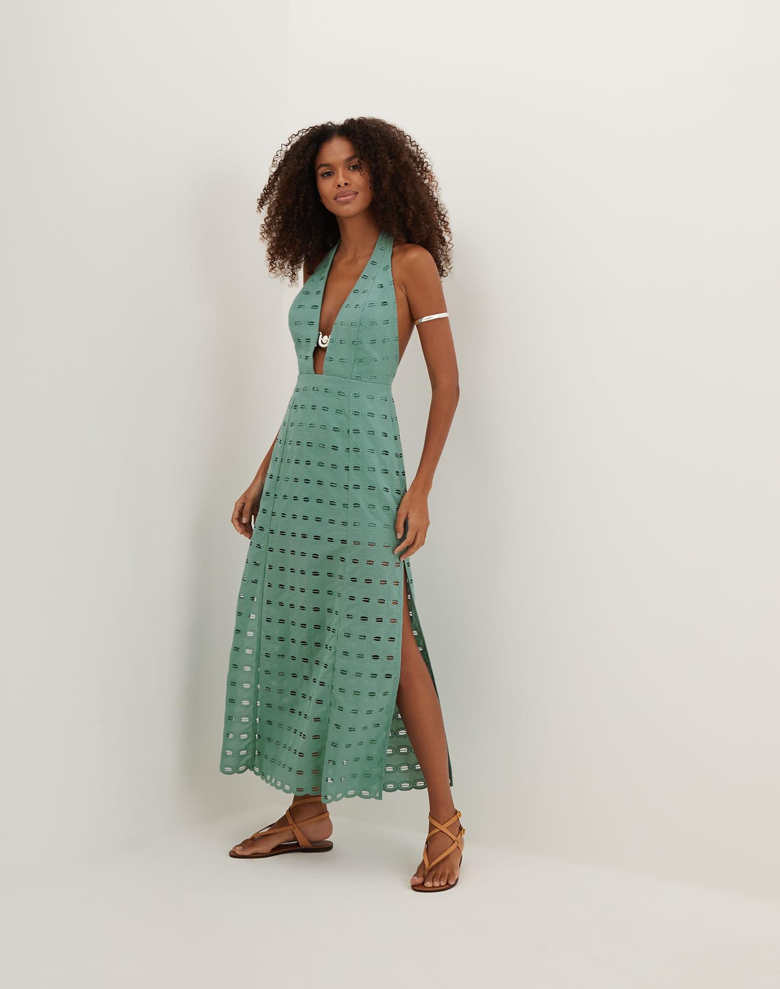 The ViX Eyelet Maryse Long Dress is a captivating maxi dress design that features a plunging V-neckline and an exposed open back, enhanced by tie closures at the neck for an adjustable fit. The silver Kori detail at the bust adds a touch of sophistication, while the eyelet fabric offers subtle intrigue with its slightly see-through quality. A skirt lining provides coverage, and a side slit adds a breezy, feminine finish. Perfect for making a statement from day to night. Style the Eyelet Maryse Long Dress with sandals and ViX accessories for a resort-ready look. Features: Maxi style dress Sleeveless Short skirt lining Side slit Plunging V-neckline Exposed open back Tie closures at neck Silver Kori detail at bust Eyelet fabric slightly see-through Style# VG252061