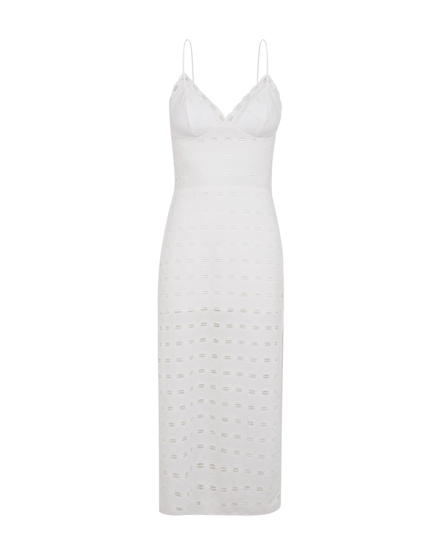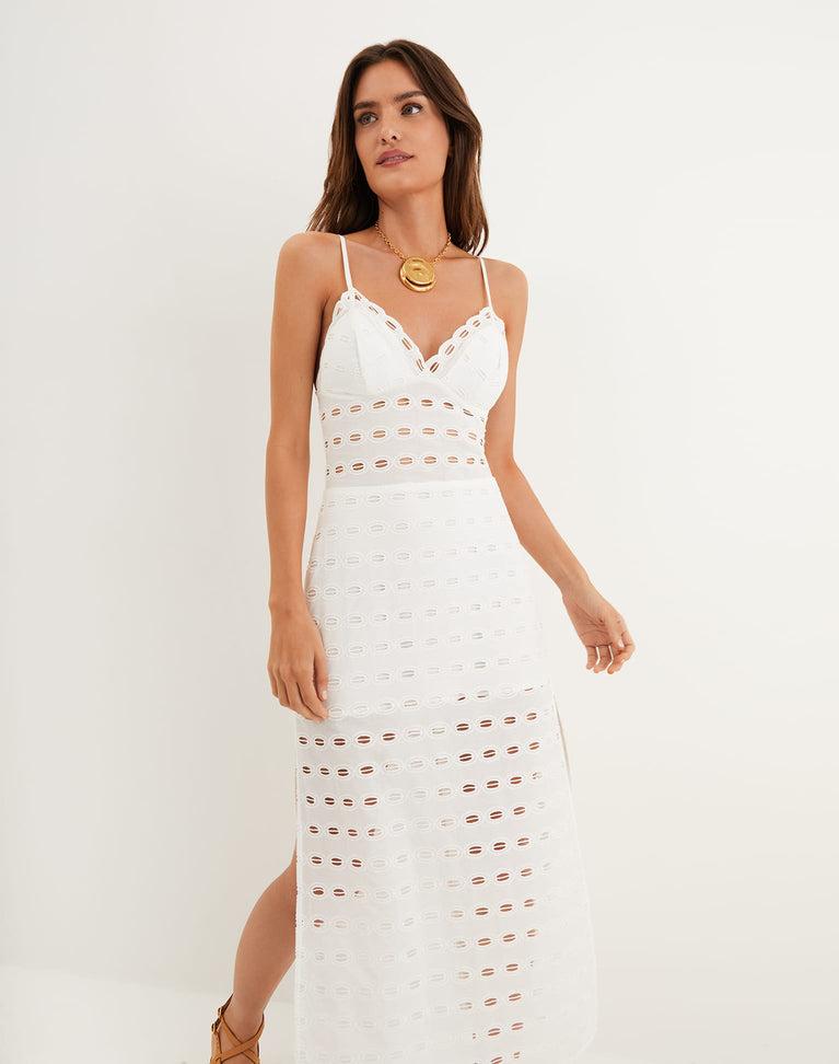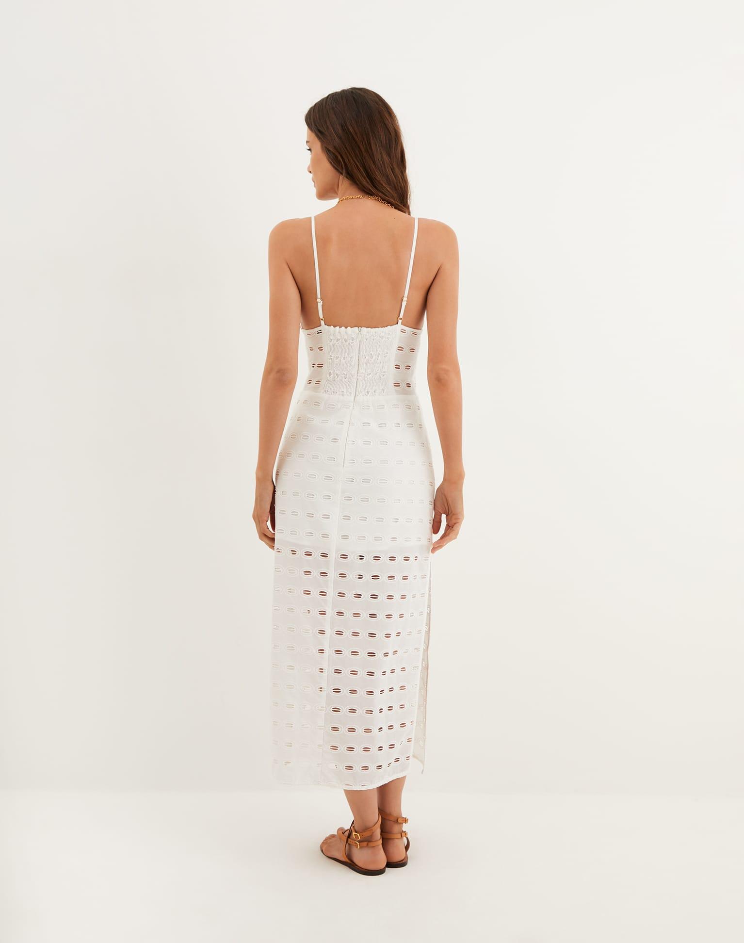 The ViX Eyelet Raya Midi Dress brings effortless elegance to life. With delicate spaghetti straps and a smocked back, this midi dress silhouette offers a flattering fit that moves with you. It comes with a daring side slit and subtly see-through eyelet fabric adding a hint of intrigue. The dress closes with a sleek bac