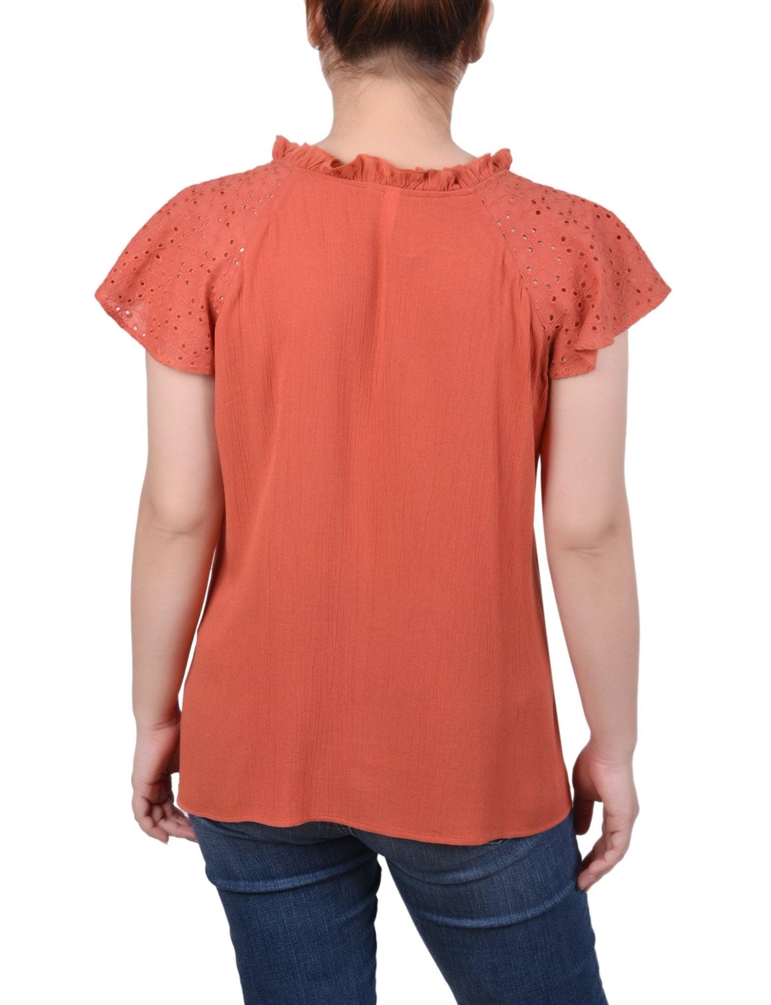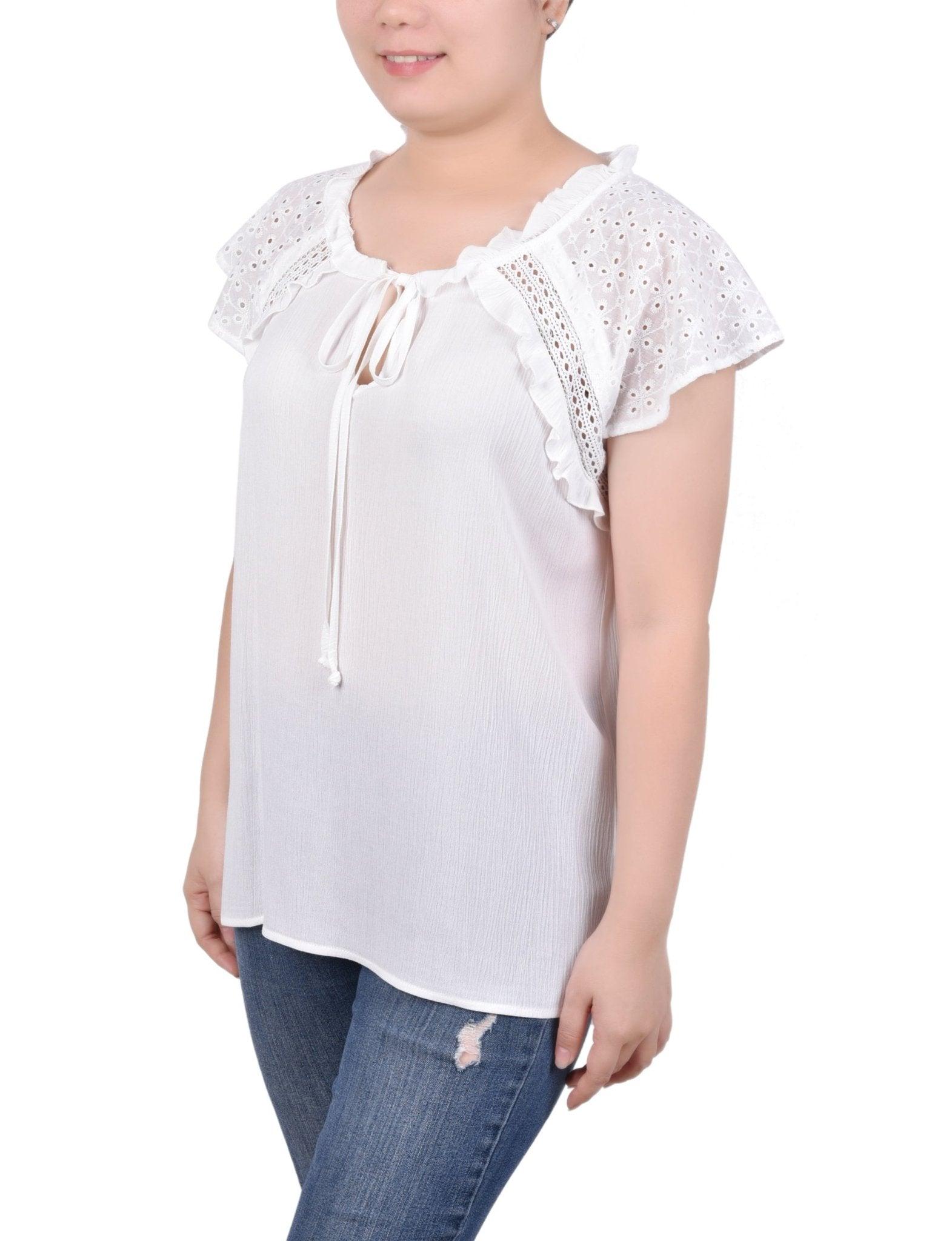 You'll be cool and confident in this flutter sleeve blouse from NY Collection. The eyelet sleeves and trims add a feminine touch. -Material: Body: 100% Rayon, Eyelet: 100% Cotton -Care Instructions: Machine Washable -Product Fit: Product Specifications: -Short Eyelet Sleeves -Ruffled Neckline -Keyhole With Self Ties -Crochet Trim -Crinkle Rayon