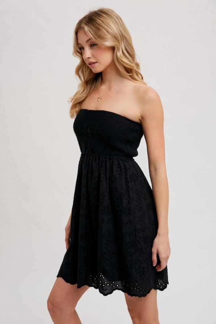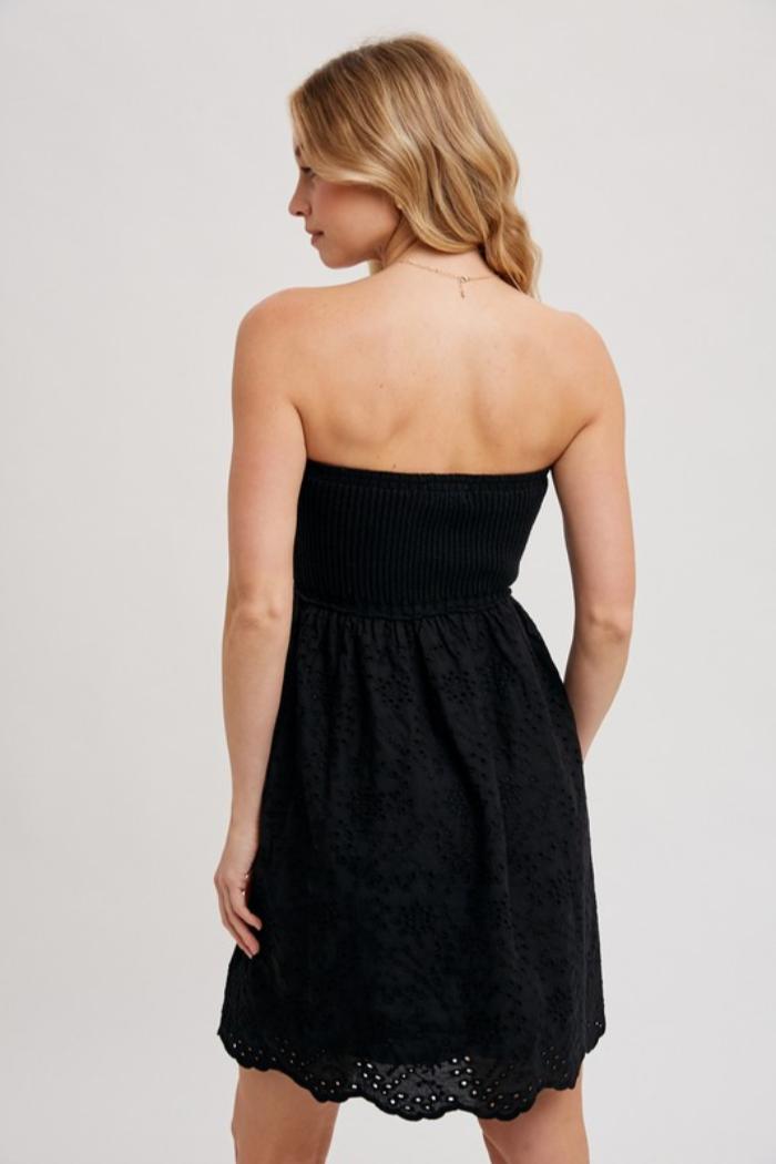 Eyelet tube flared midi dress. Model is wearing a size Small