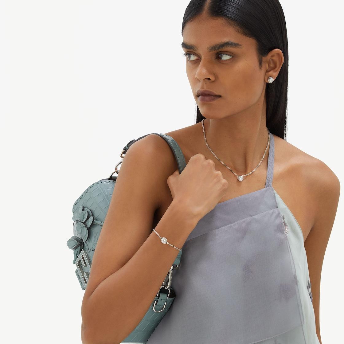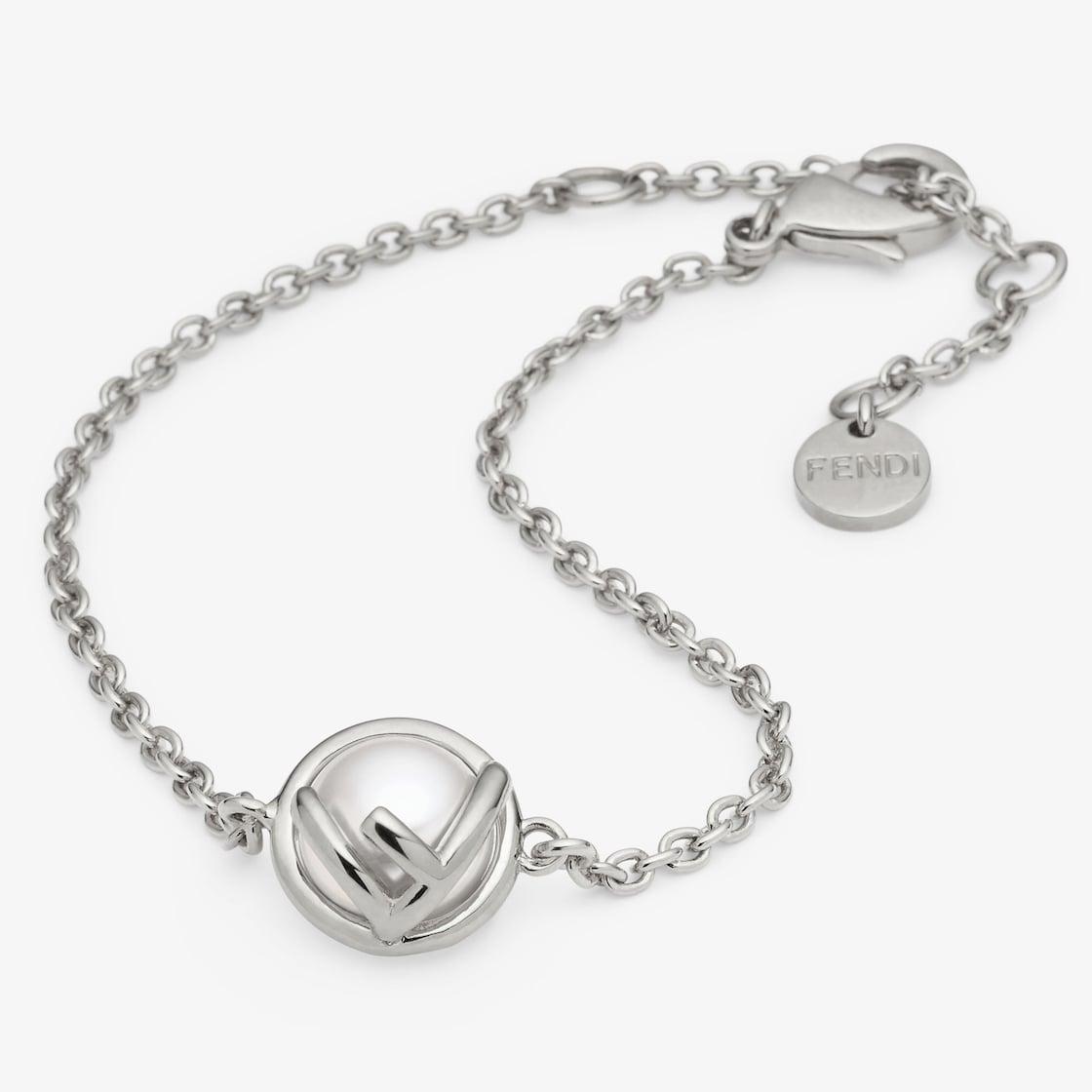 Fine chain bracelet with white bijou pearl inserted in the F is Fendi motif. Adjustable clip closure. Made of palladium-finish metal. Made in Italy