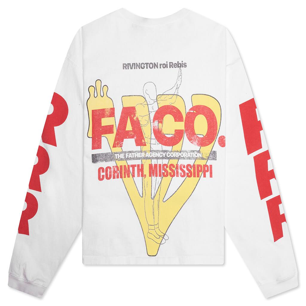 The FA-CO L/S Tee #2 in Optic White merges comfort with statement design. Crafted from cotton, this long-sleeve tee features an oversized fit and dropped shoulders for a relaxed, contemporary silhouette. An extra-thick crewneck collar and ribbed cuffs add durability, while cracked printed graphics on the front and back provide a bold, textured aesthetic. A woven label adds a finishing touch, reflecting attention to detail and timeless appeal. 100% Cotton Oversized fit Dropped shoulders Extra thick crewneck collar Ribbed cuffs Woven label Cracked printed graphics front & back Style No: FACO-LS40-WHTE FACO LS40 OPTI