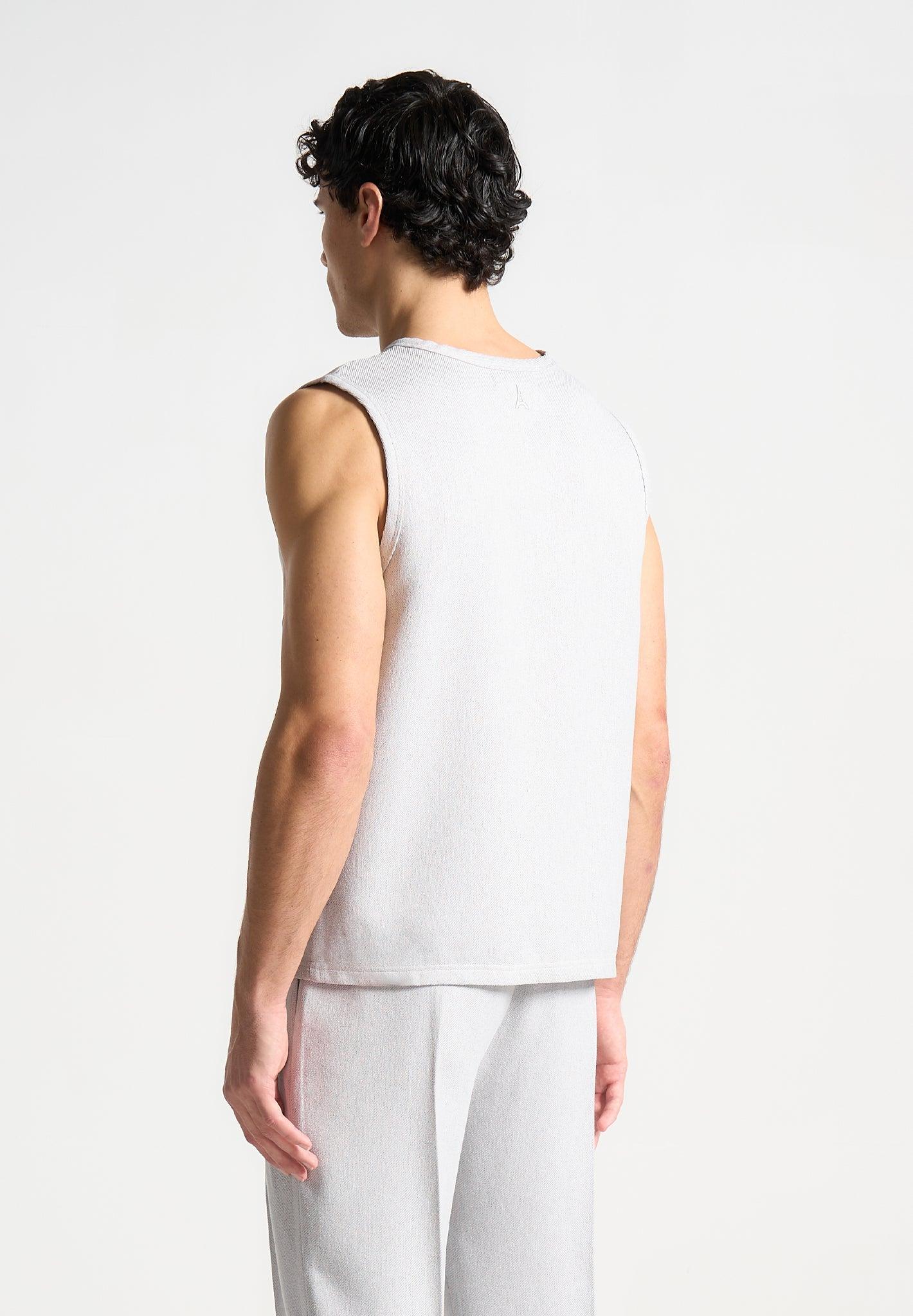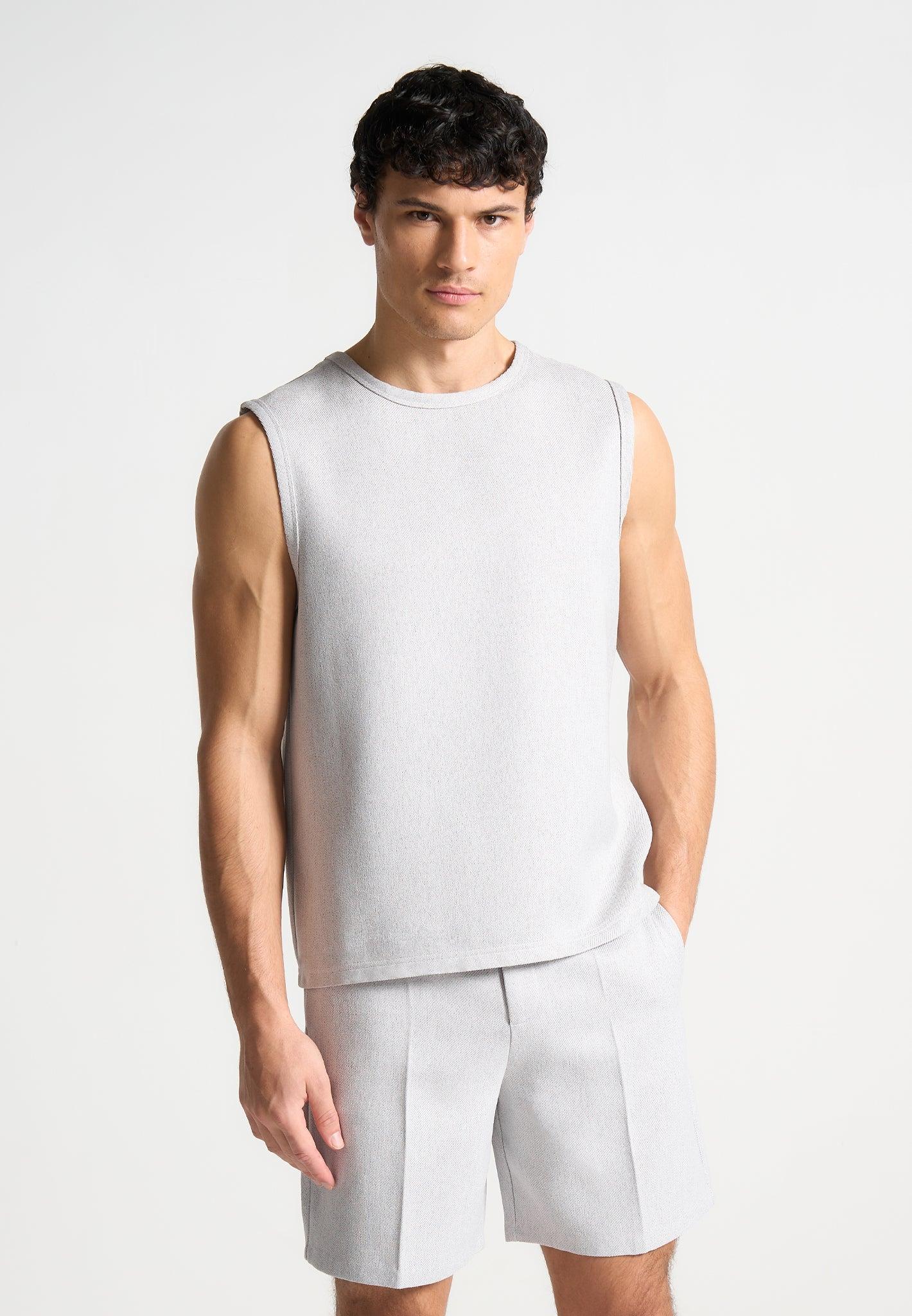 Our Boxy Textured Vest in Taupe, expertly crafted with a relaxed fit, offers both comfort and style. The sleeveless design and soft material provide a lightweight feel, while the embroidered Eiffel detail adds a touch of sophistication. Perfect for any fashion-forward wardrobe, it's a must-have for layering or wearing alone. Fabric: Always check the care label for wash instructions. Model is 6'0", 40" Chest, 30" Waist and Wears Size Medium Based On Size M - Front Length cm/in, Chest cm/in, Sleeve Length cm/in Stretch Factor - /3