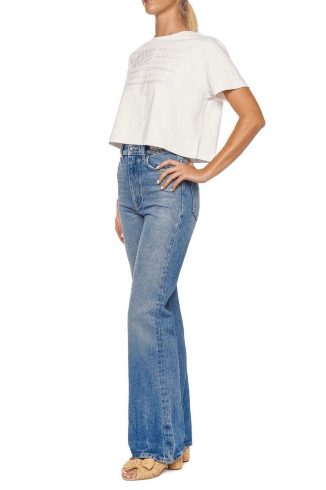 This white cotton t-shirt features short sleeves with a slightly boxy fit. Complete with a faded flag motif at the front. Slips on 100% cotton Gentle hand wash cold