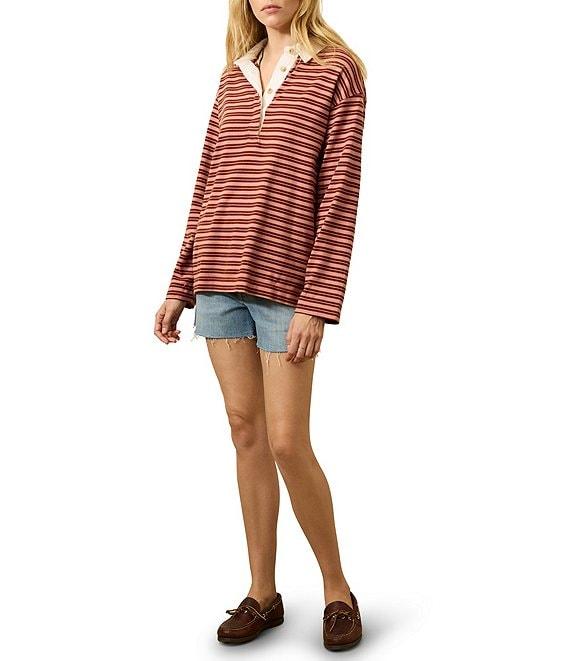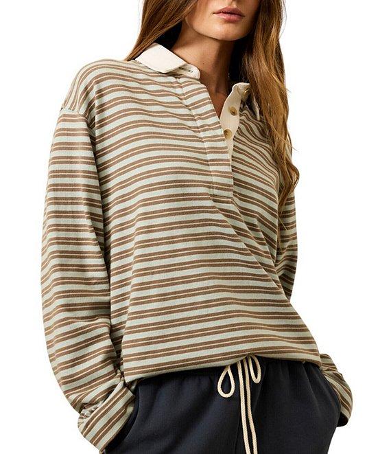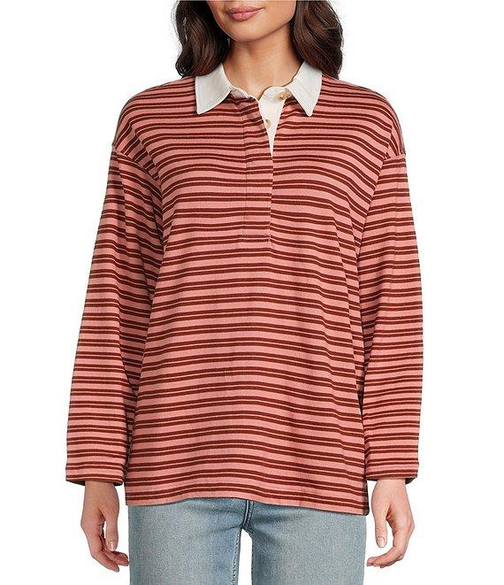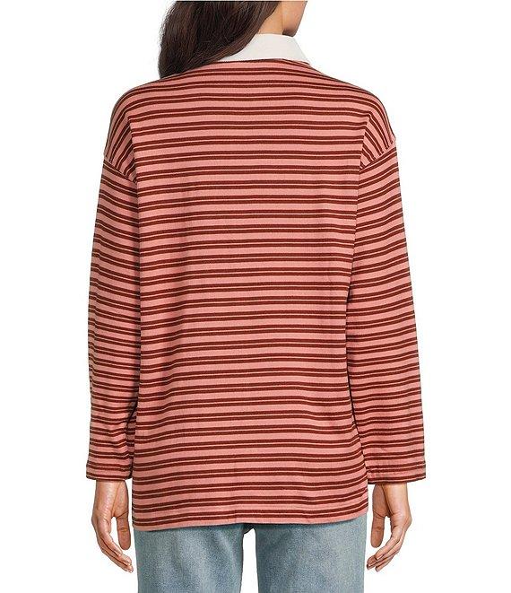 From Faherty, this sweater features: Knit fabrication Collared v-neck Long sleeve Horizontal stripe print Straight hemline Pull on construction Approx. 27" HPS in length Organic cotton Turn inside out before machine washing on a cold and gentle cycle with like colors. Do not bleach. Tumble dry low, remove promptly. Cool iron when needed. Imported.